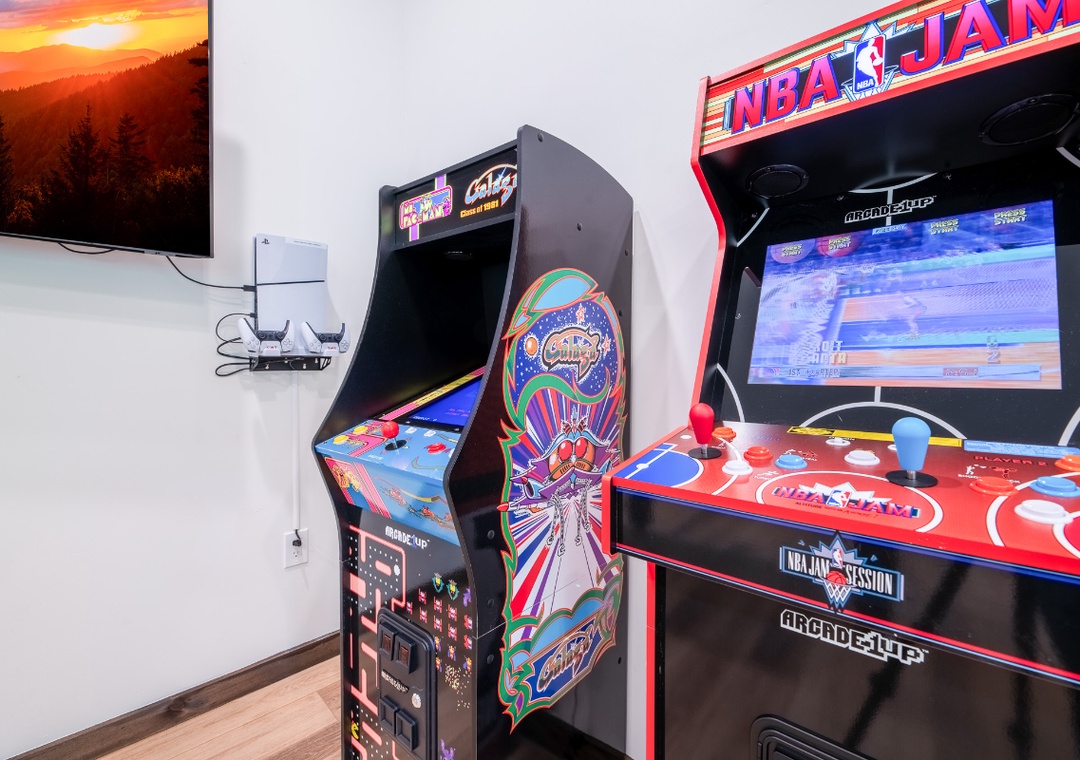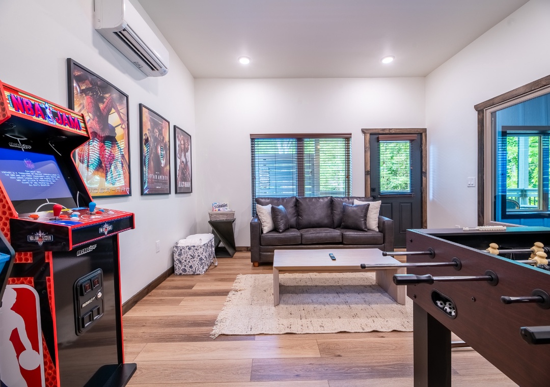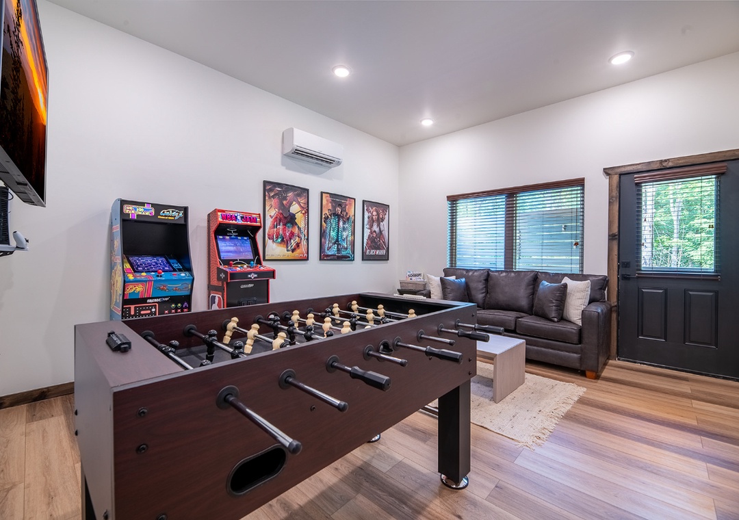 Step inside and be greeted by the main living room that serves as the central gathering space. Curl up in plush seating by the 55" Smart TV and the electric fireplace that enhances both morning coffee moments and relaxed evenings after a day of adventures. Downstairs, the game room awaits, featuring a 65" Smart TV with PlayStation and arcade games. Classic gaming lovers will be thrilled with the Ms. Pac-Man, Galaga, and NBA Jam arcades, bringing a nostalgic thrill to every stay. You can also challenge friends or family to a lively match on the foosball table, or kick back on the oversized seating. Also on the lower level, find your very own private heated indoor pool. Rain or shine, day or night, you can enjoy a dip in warm waters without ever stepping outside. Free WiFi is also available throughout the property.