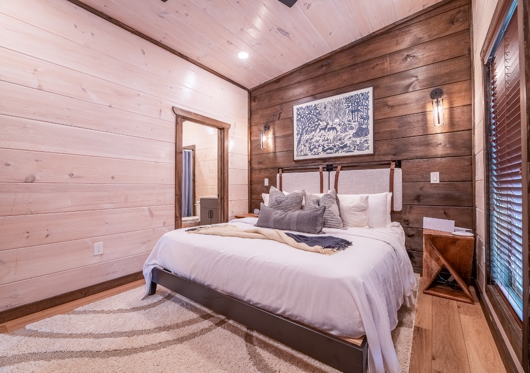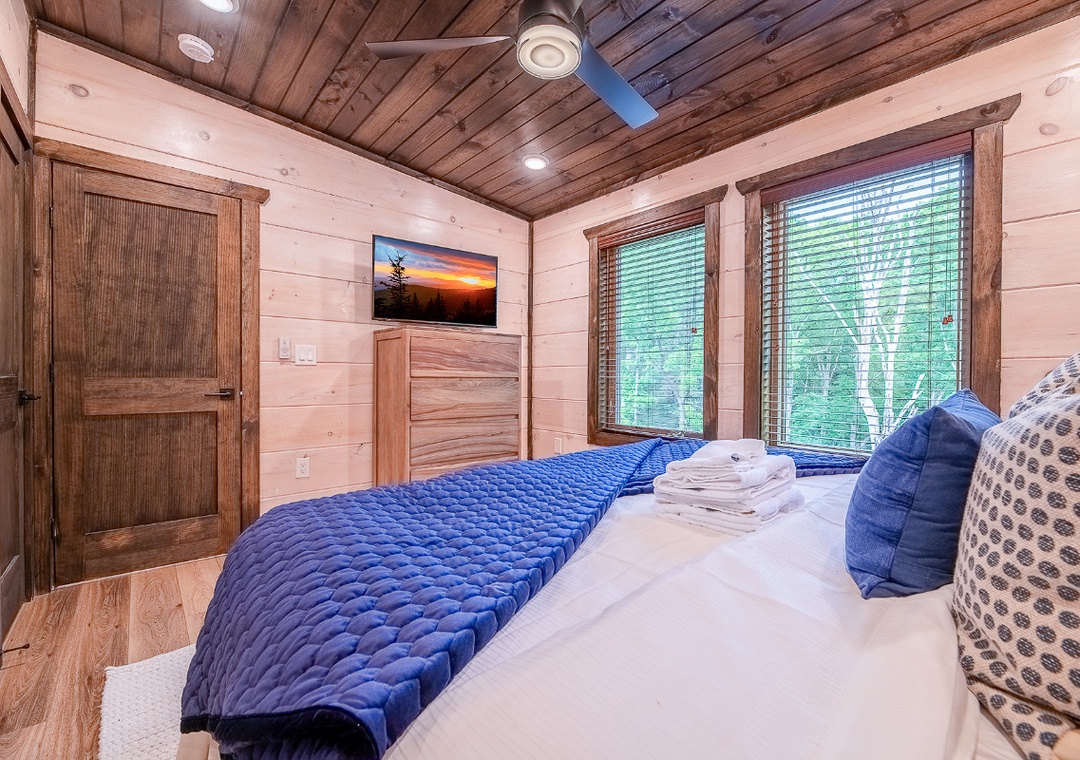 ✔ Bedroom #2 (Upper Level): Cozy Bedroom with a King-sized Bed and a Flat-screen TV; Attached Full Bathroom with Stand Up Shower