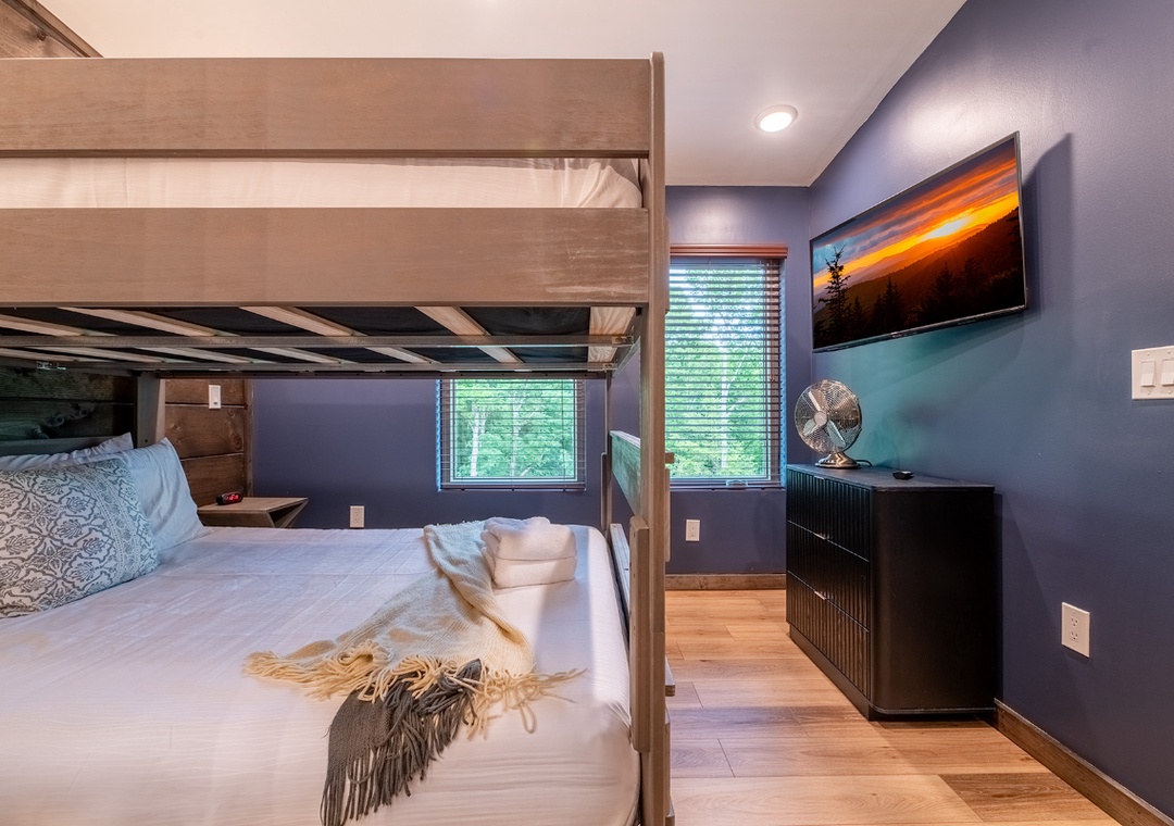 ✔ Bedroom #4 (Upper Level): Inviting Bedroom with a Queen-over-Queen Bunk Bed and a Flat-screen TV; Attached Full Bathroom with Stand Up Shower