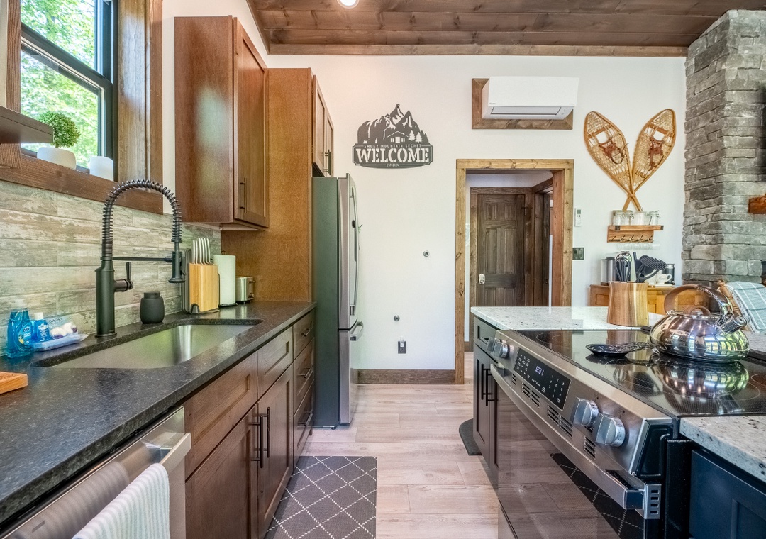Step inside and be greeted by a stunning open-concept living space that feels both spacious and inviting. Floor-to-ceiling windows line the main living area, filling the space with natural light and framing the breathtaking views of the wooded surroundings. At the heart of the living room is a beautifully designed electric fireplace that adds a warm and romantic glow to the space. Above it, a massive 65” Samsung Smart TV provides endless entertainment. The seamless layout flows into the fully equipped, modern kitchen which offers all the tools you need to prepare everything from a gourmet dinner to a simple breakfast. Free WiFi is also available throughout the property.