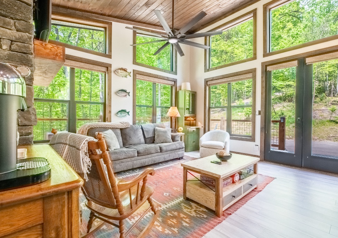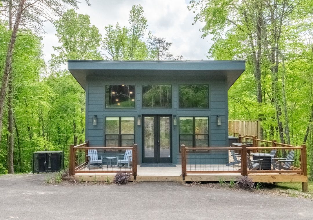 Designed to immerse you in nature, Smoky Mountain Secret feels like a sophisticated treehouse retreat. Floor-to-ceiling windows throughout the cabin flood the space with natural light and frame stunning views of the surrounding forest. Our floor plan is ideal for both couples and small groups alike and is the perfect get-a-way. So, pack your bags – because the mountains are calling!