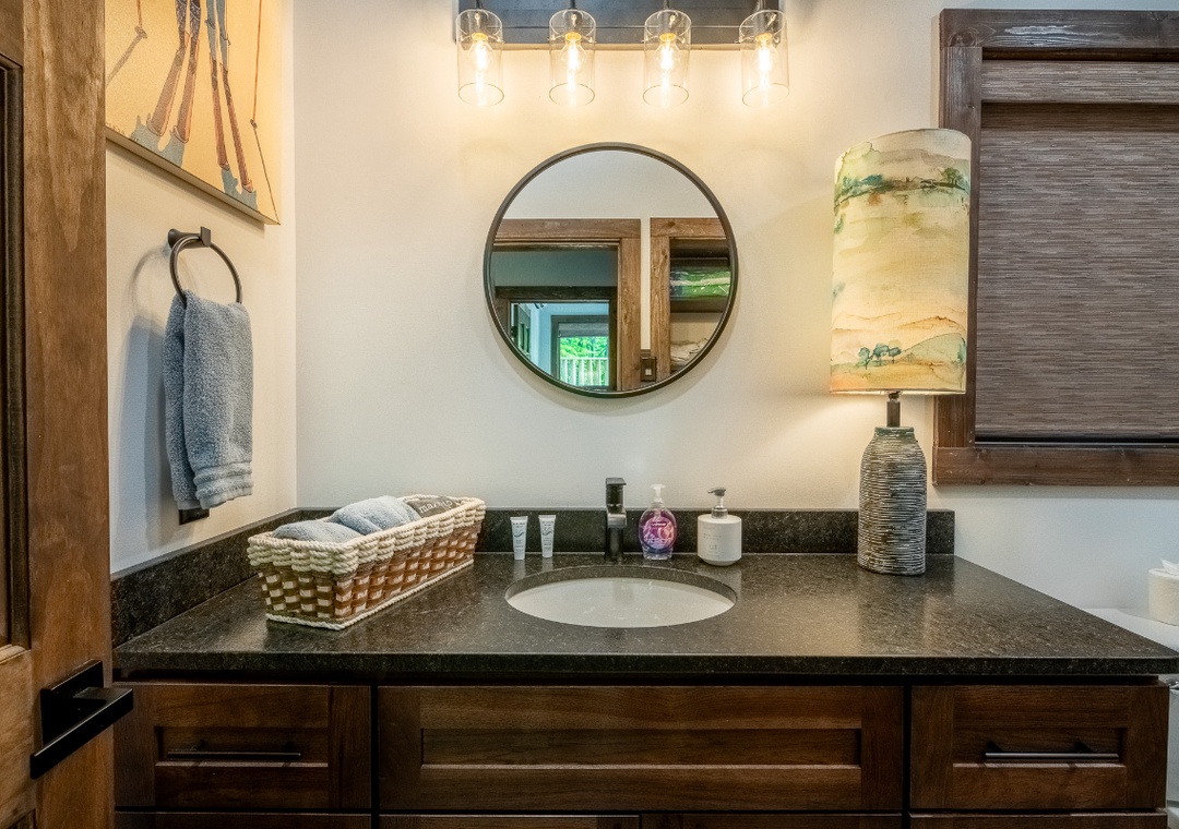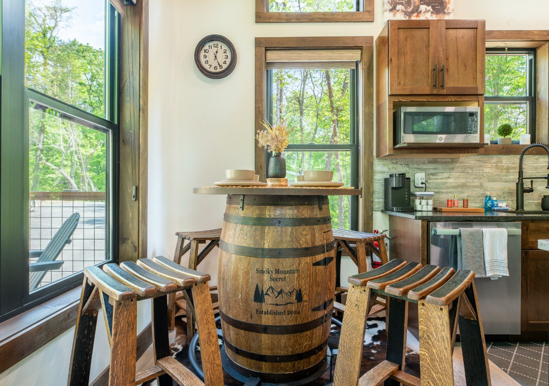 The fully-equipped kitchen boasts modern amenities making it easy to prepare delicious meals for your family or friends. Well-appointed with a full-sized refrigerator, dishwasher, stove, microwave, and other kitchen appliances perfect for making breakfast, lunch, or dinner throughout your stay! All pots, pans, glasses, plates, silverware, etc. are also there for you! Gather around the inviting wooden dining table and chairs to share stories and laughter as it invites you to savor each bite while taking in the natural beauty of the surroundings.
