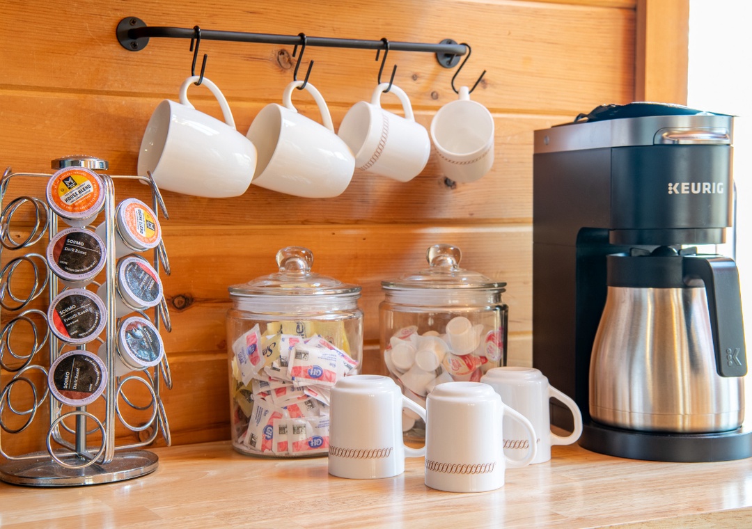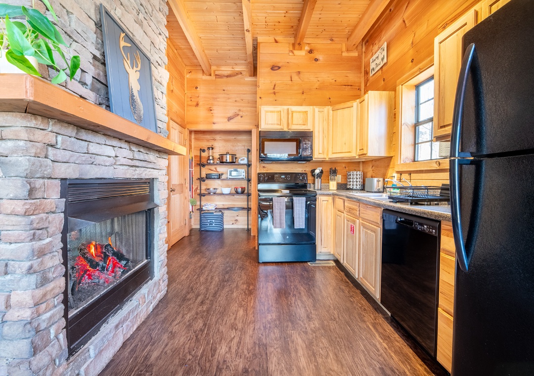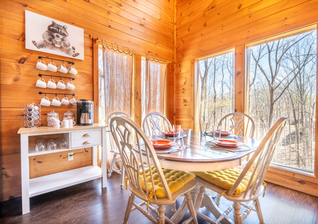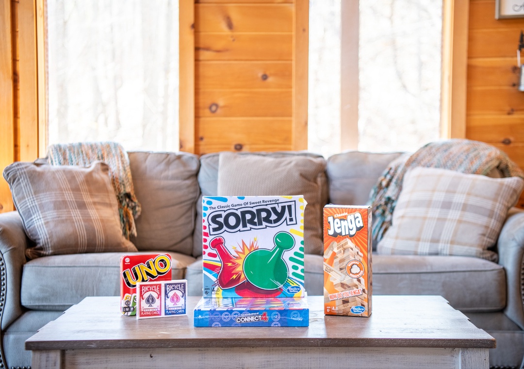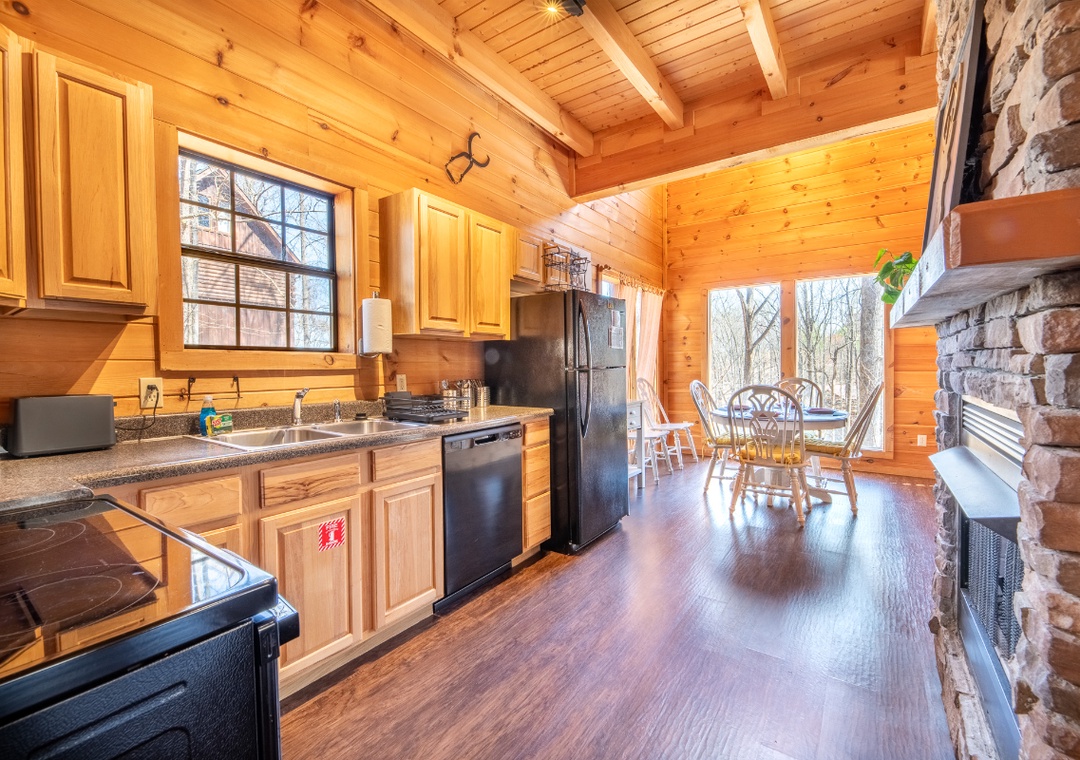 From the moment you step inside, you’ll be greeted by vaulted ceilings, warm wood accents, and large windows that let in natural light and stunning views of the surrounding trees. The open-concept living area is designed for relaxation, featuring plush seating where you can gather with loved ones and unwind after a day of mountain adventures. The centerpiece of the space is the seasonal stone propane fireplace (available from May 1st to Oct 1st), which adds both warmth and ambiance to the living room and dining area. Also find the game room, which is a paradise for guests of all ages. Upstairs on the loft is a pool table that challenges the group for a friendly competition. Free WiFi is also available throughout the property.