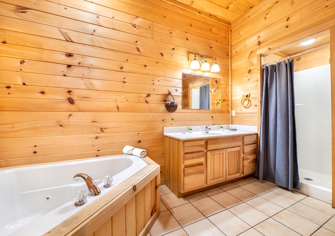 ✔ Bedroom #2 (Upper Level): Relaxing Bedroom with a King Bed and Flat-screen TV; Attached Full Bathroom with Stand Up Shower and Soaker Tub