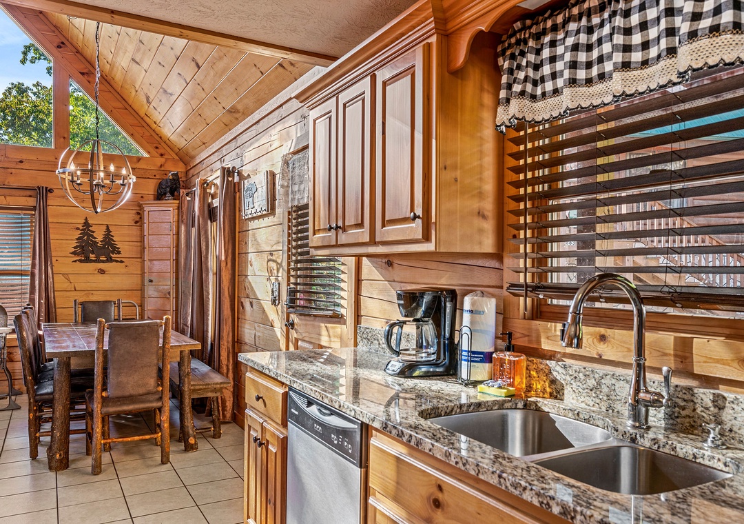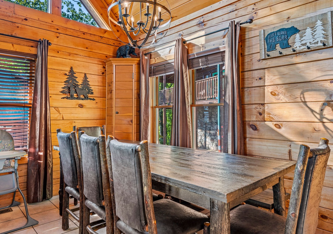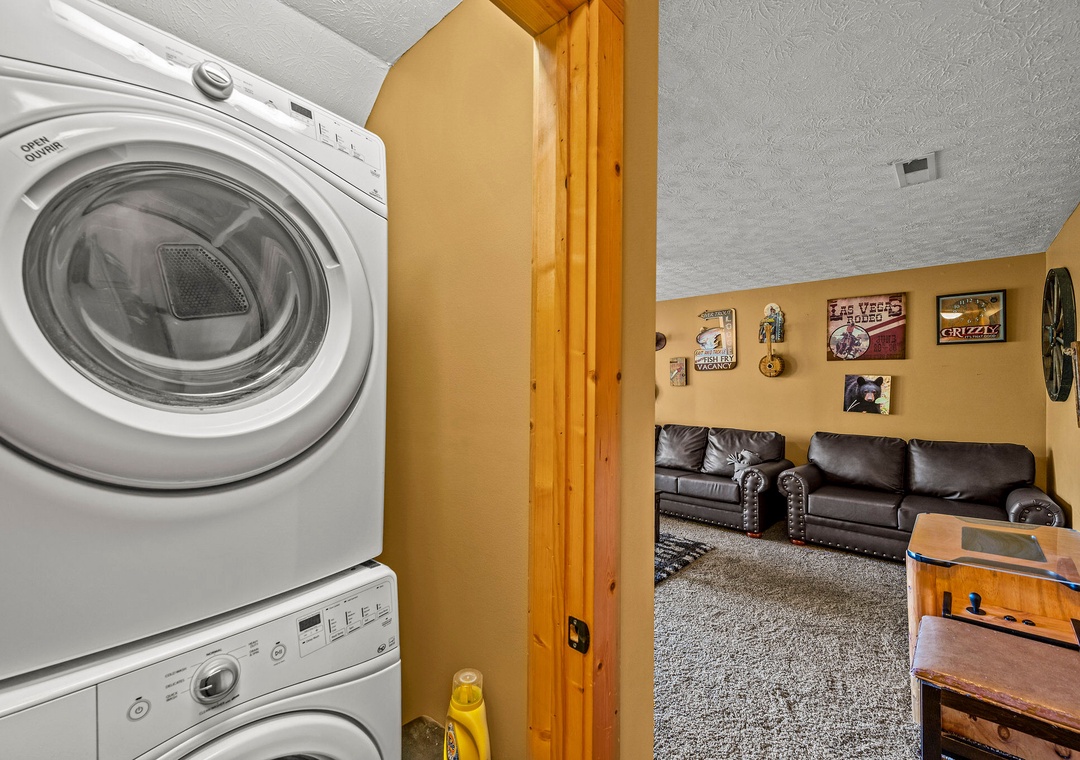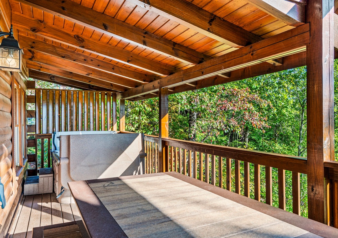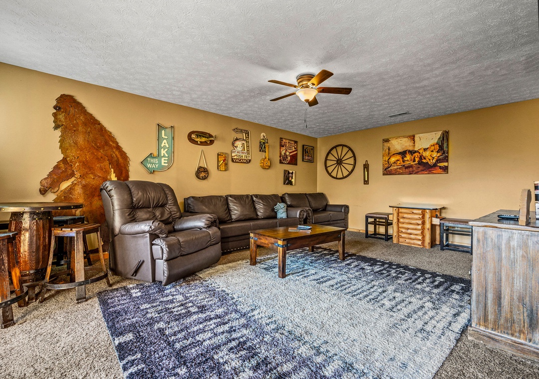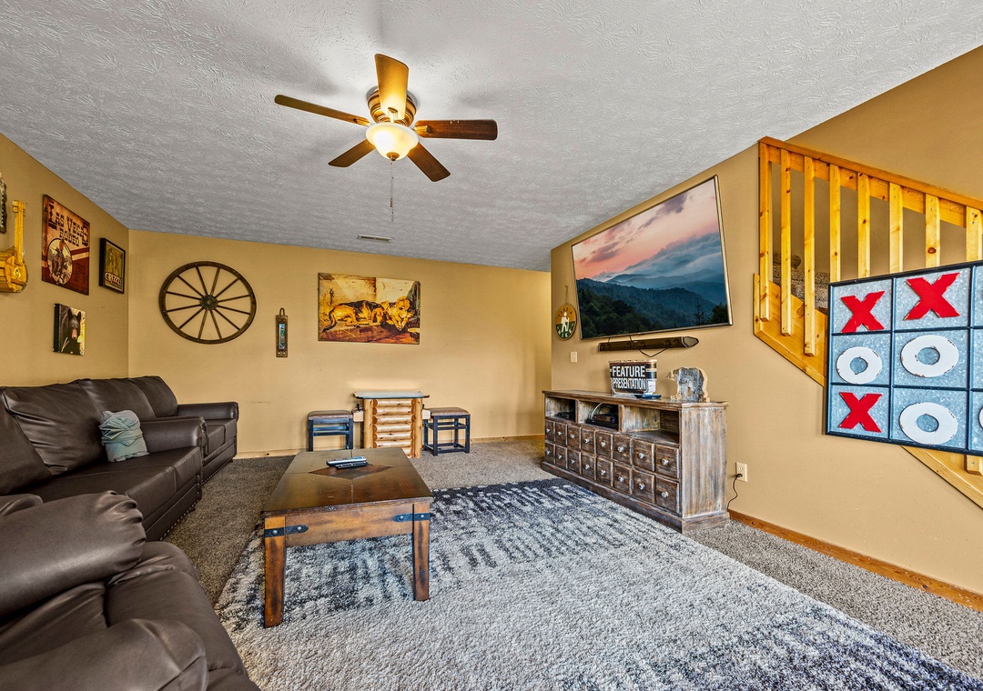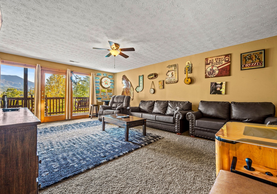 In addition to its scenic beauty, “Some Peak Somewhere Cabin” is a paradise for entertainment and relaxation, offering a wide array of options to keep you and your family entertained throughout your stay. First on the list is the theater room, which adds a touch of cinematic class to your mountain retreat. Whether you're enjoying a family movie night, watching the big game, or having a cozy evening, the theater room provides an immersive experience that's sure to delight everyone in your group. There's also a Tic-tac-toe board and an arcade to enjoy friendly matches with the family. Go outside onto the spacious deck and get front-row seats to the natural wonders that surround the cabin. It provides the perfect spot for enjoying your morning coffee, sharing conversations, or simply savoring the fresh mountain air. Here, you can also soak in the soothing warmth of the bubbling hot tub while gazing out at the breathtaking mountain scenery! Our cabin is also part of the prestigious Black Bear Falls Resort, offering guests access to a seasonal outdoor pool (typically opens from Memorial Day to Labor Day). Unwind, make a splash, and savor the natural beauty of the Smoky Mountains in a way that complements the relaxation and adventure of your cabin experience.