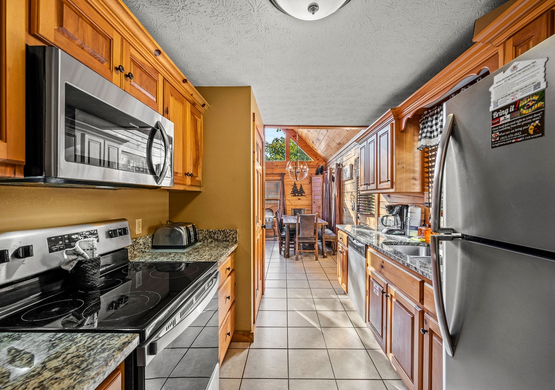 The fully equipped kitchen is a haven for culinary enthusiasts. Complete with a full-sized refrigerator, dishwasher, stove, microwave, and other kitchen appliances perfect for making breakfast, lunch, or dinner throughout your stay! All pots, pans, glasses, plates, silverware, etc. are also there for you! Adjacent to the kitchen, you'll find a large wooden table with comfortable seating, making it a wonderful space for enjoying your culinary creations with family and friends.
