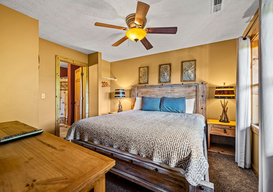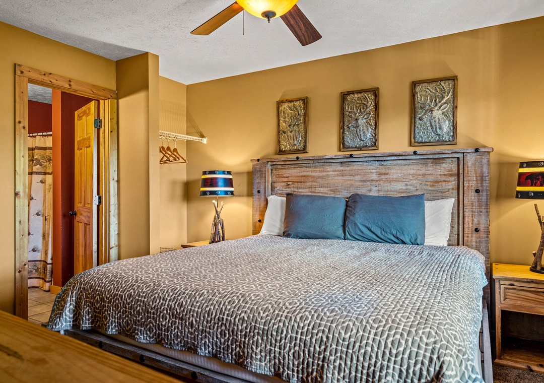 ✔ Bedroom #2 (Main Level): Comfy bedroom with a King-size bed, Flat-screen TV, and access to a full bathroom with a shower and tub combo
