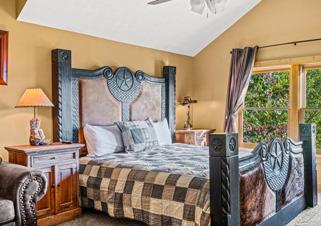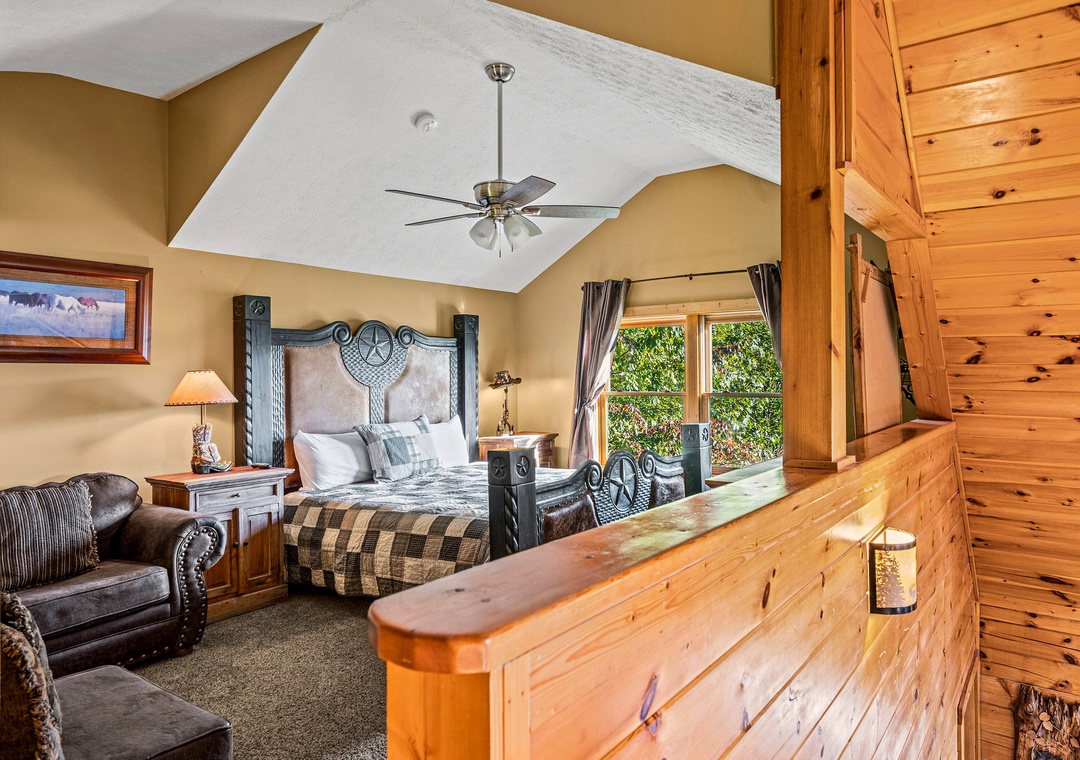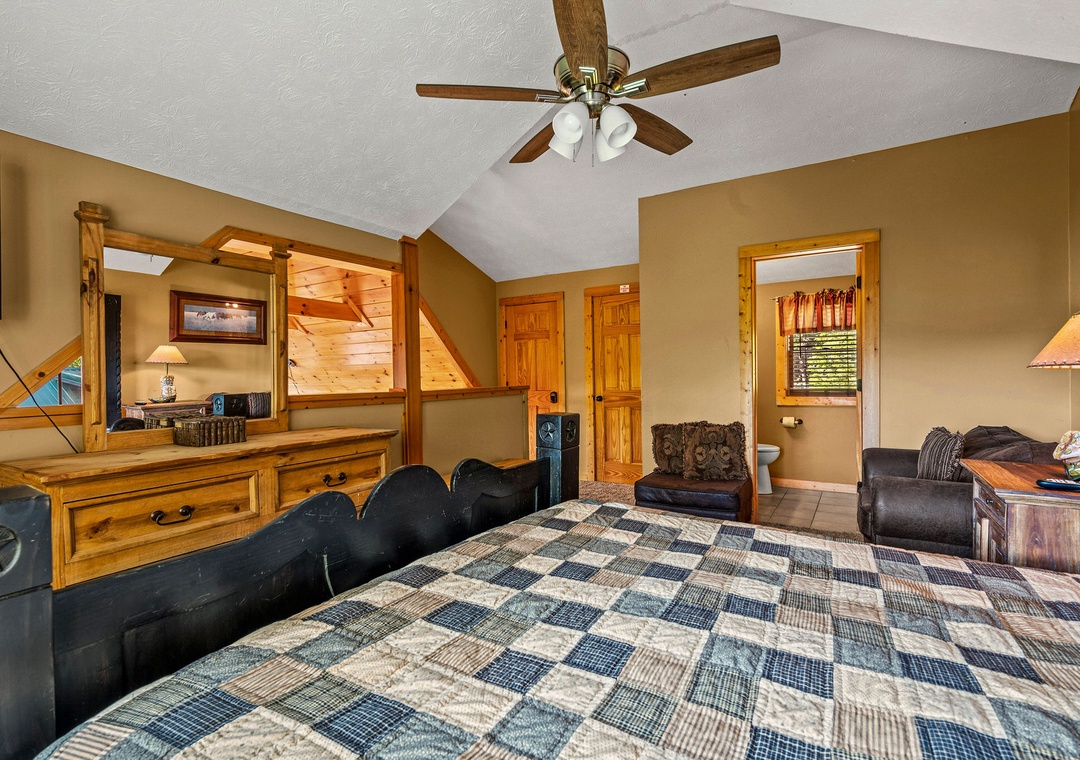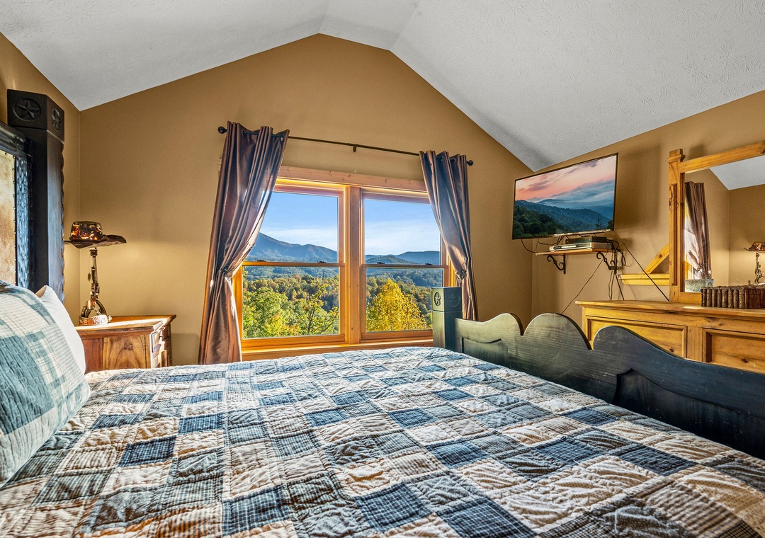 ✔ Bedroom #1 (Loft): Comfy bedroom with a King-size bed, Flat-screen TV, and attached bathroom with a shower and tub combo