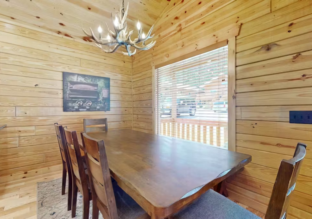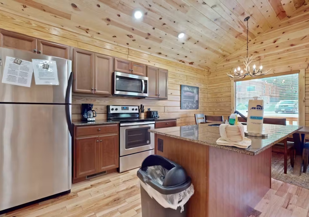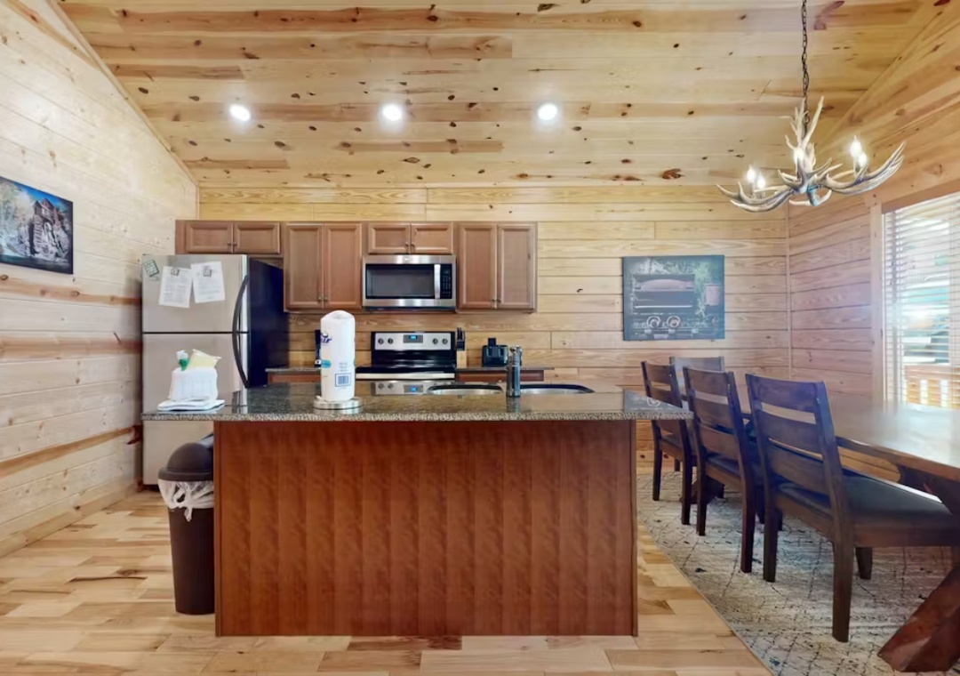 The main living space is the heart of the cabin, featuring a spacious open-concept layout that brings people together while still offering room to stretch out and unwind. Large windows and wood-paneled walls evoke the timeless charm of a mountain lodge, while modern furnishings and amenities ensure you don’t sacrifice any of the comforts of home. The propane fireplace adds a welcoming glow and warmth, making it a favorite spot to relax during cooler mountain evenings. Just above the hearth, a 55" Vizio Smart TV is perfectly placed for streaming your favorite movies, shows, or music. The kitchen and dining area flow seamlessly from the living room, making it easy to stay connected no matter what you’re doing. You’ll also find the cabin’s two spacious bedrooms which offer restful retreats with comfortable bedding. Free WiFi is also available throughout the property.