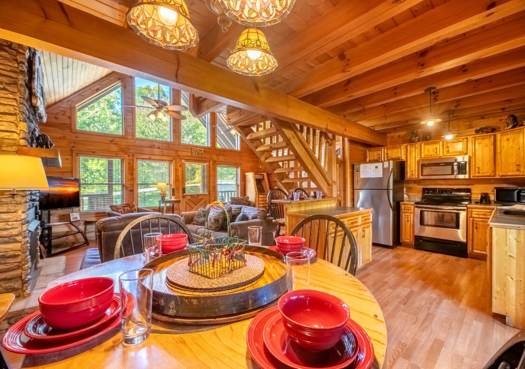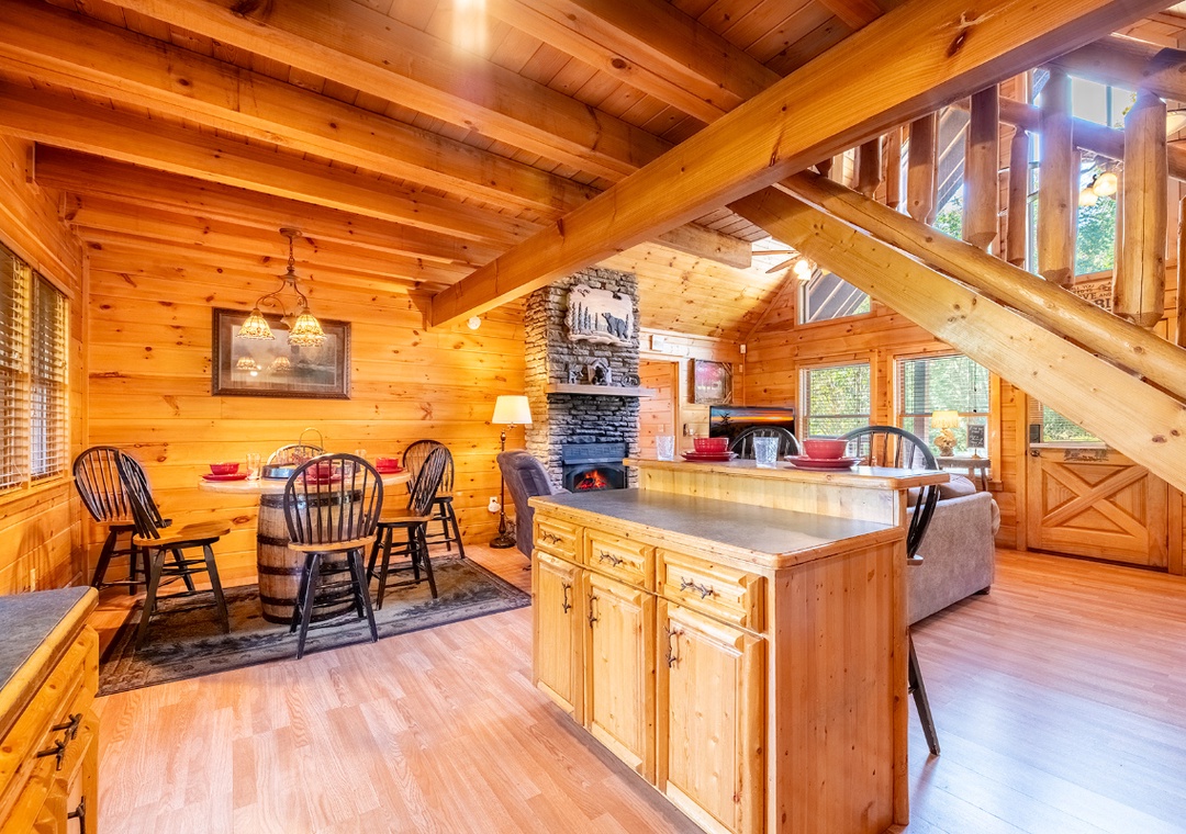 The open-concept living room welcomes you with warm wood tones and a soft glow from the propane fireplace, perfect for unwinding after a day exploring the mountains. Sink into the plush seating, kick your feet up, and watch your favorite shows or a movie on the flat-screen TV. Just a few steps away, the multicade arcade adds a fun, nostalgic touch that keeps everyone entertained between adventures. The living area flows seamlessly into the fully equipped kitchen and dining space, making it easy to cook, eat, and connect without missing a moment together. Upstairs, the spacious game loft is a centerpiece of indoor fun, overlooking the living area and filling the home with light and laughter. Free WiFi is also available throughout the property.