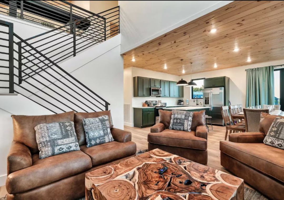 The main living area features plush seating that surrounds a cozy electric fireplace and a Roku TV, creating an inviting space for movie nights or simply enjoying the glow of the fire after a full day. The open layout seamlessly connects the living room to the dining space and kitchen, allowing everyone to feel together while still enjoying room to spread out. Downstairs, the theater/game room is designed for all ages and endless fun. Just steps away, the private heated indoor pool transforms your stay into a true resort-style getaway. Upstairs, the open loft doubles as an exercise area, which includes a workout station and a stationary bike, giving you the option to maintain your routine without ever leaving the lodge. Free WiFi is also available throughout the property.