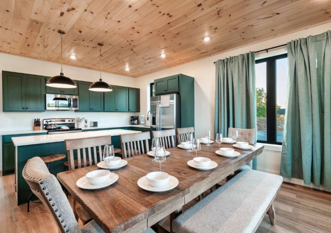 The fully-equipped kitchen boasts modern amenities, making it easy to prepare delicious meals for your family or friends. Well-appointed with a refrigerator, dishwasher, stove, microwave, and other kitchen appliances, perfect for making breakfast, lunch, or dinner throughout your stay! All pots, pans, glasses, plates, silverware, etc., are also there for you! Gather around the inviting dining table to savor your meal while enjoying the fresh mountain air.