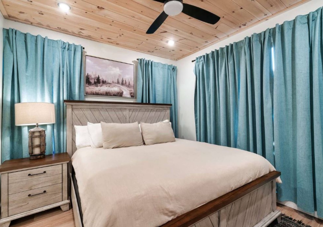 ✔ Bedroom 2 (Main Level): Comfy Bedroom with a King-Bed and a flatscreen TV; Attached Full Bathroom with Shower/Tub Combo