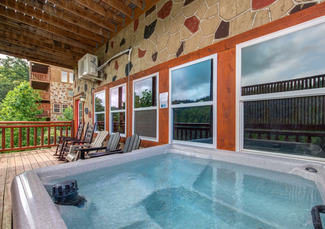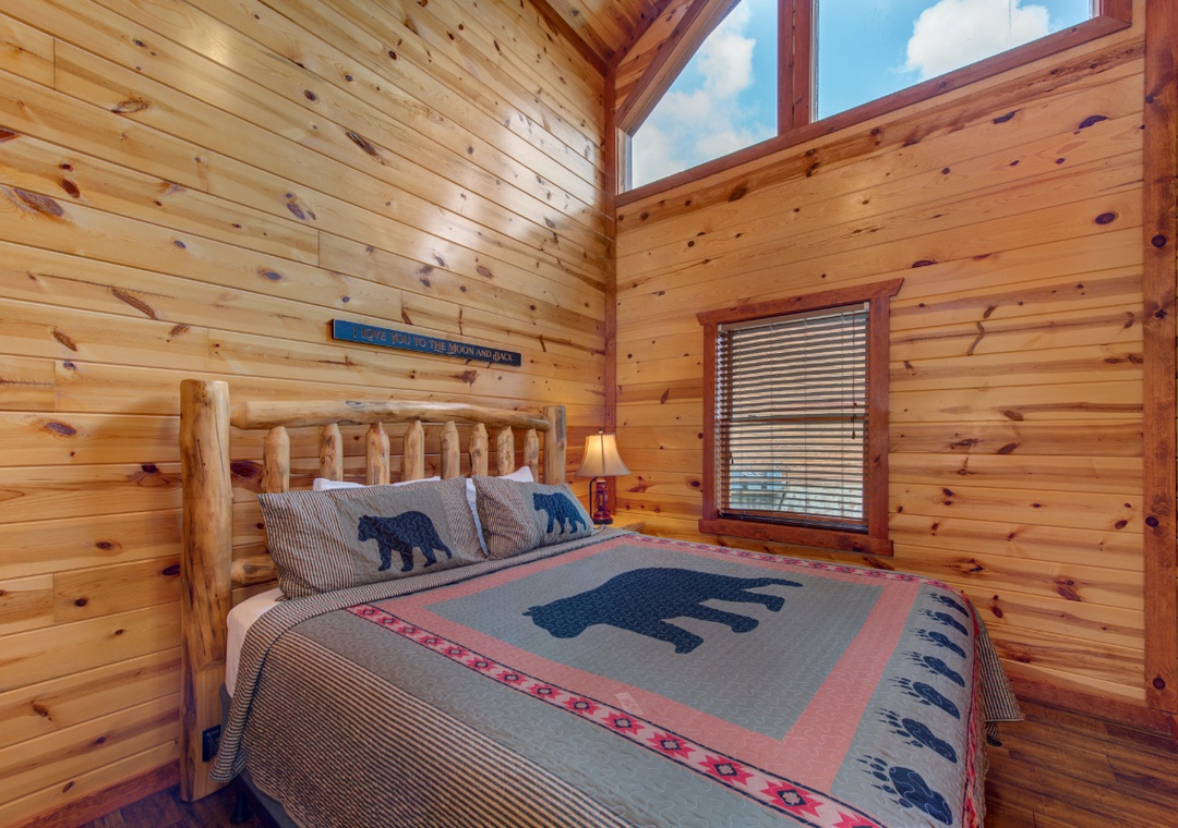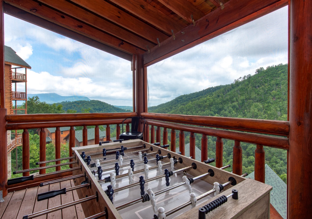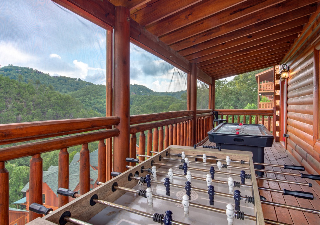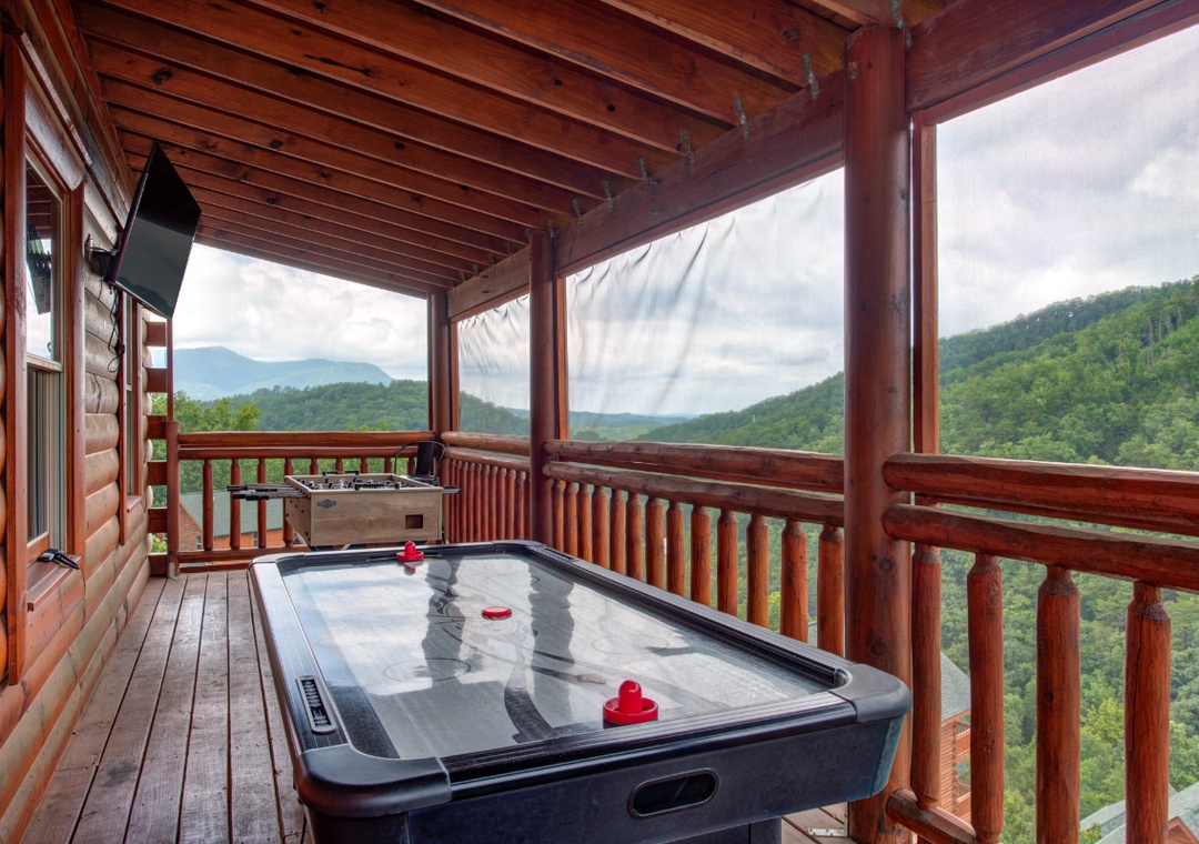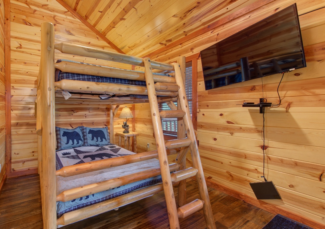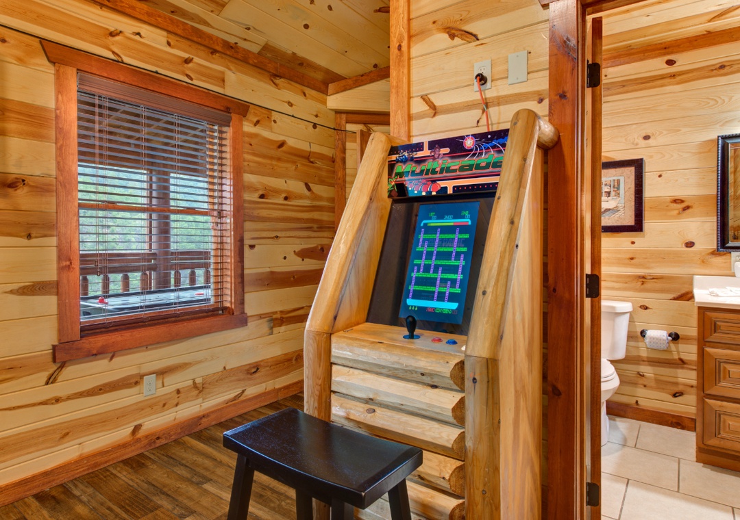 In the living room, kick back on the plush seating and gather around the electric fireplace while watching your favorite shows or movies on the massive 60" Smart TV mounted above it, making it the perfect place to unwind together after a long day of adventure. The lower level is home to your own private heated indoor pool. Rain or shine, day or night, the pool is available exclusively to you and your guests. Complete with a wall-mounted TV and pool equipment, this area is ideal for everything from family swim time to laid-back lounging. Step just outside the pool area onto the lower-level back deck, where a bubbling hot tub awaits. It’s the perfect spot to relax and soak your cares away while still staying close to the action. Upstairs, the screened-in upper-level deck is a game room with a view. It features both an air hockey table and a foosball table, letting guests challenge each other to spirited matches in the fresh mountain air without worrying about the weather. Inside the lodge, the fun continues in the bunk bedroom, which comes equipped with a multicade arcade machine loaded with classic games.
