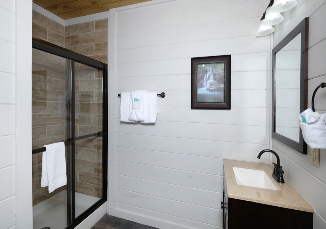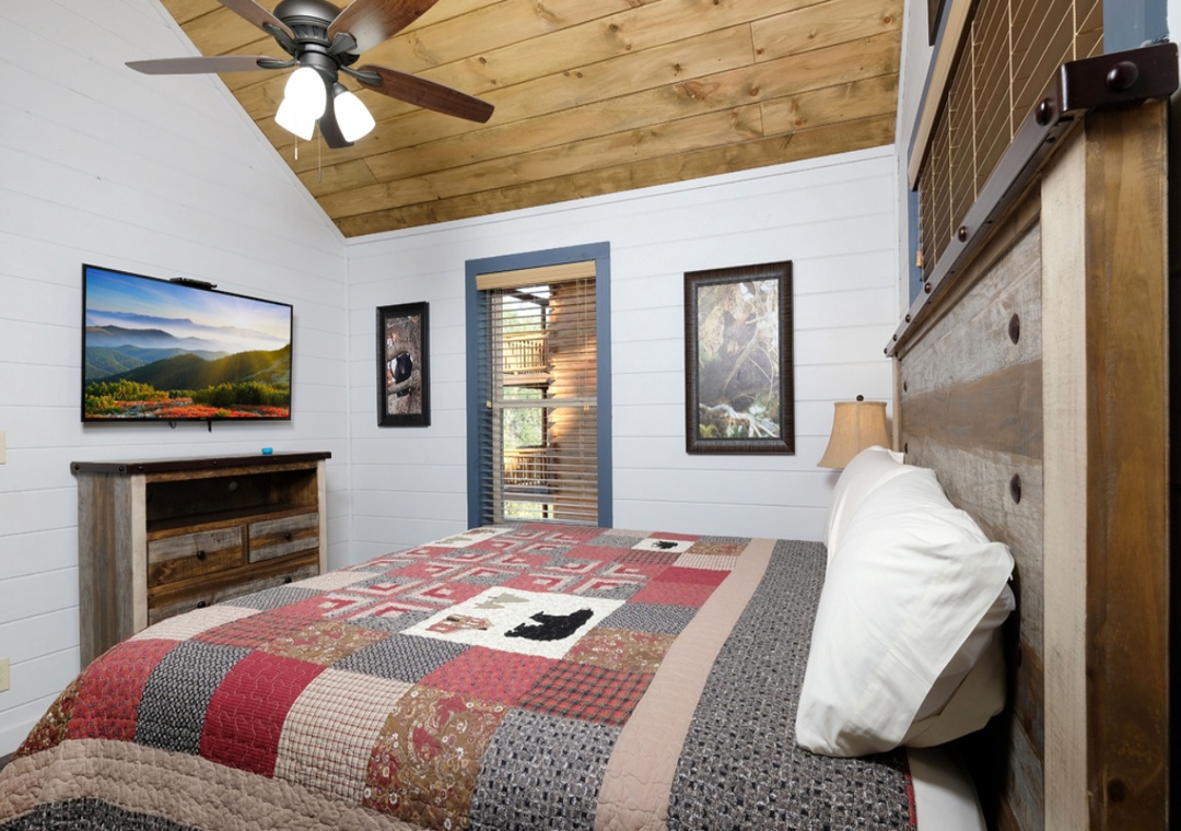 ✔ Bedroom #1(Main Level): Cabin perfect King-size bed with flat screen TV; Attached Full Bathroom with Stand Up Shower