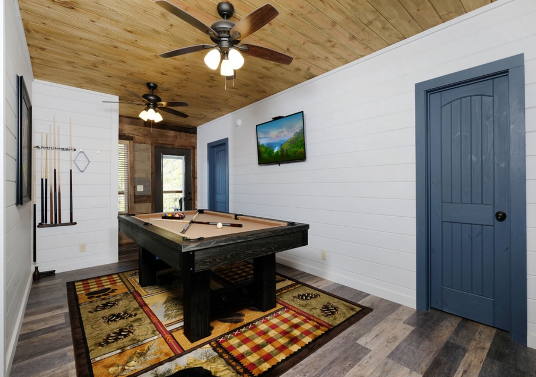 The living room is the perfect gathering space, featuring exposed beams, modern cabin woodwork, and a stacked stone electric fireplace that sets the tone for cozy evenings. Sink into the plush sofa, which doubles as a queen sleeper, and admire the beautiful valley views through the windows, or unwind with a movie night on the big screen TV. Prepare delicious meals in the fully equipped galley kitchen, complete with stainless steel appliances, granite countertops, and country chic lighting overhead. Gather around the dining table, with seating for six, for family meals or game nights. Go downstairs and immerse yourself in endless fun in the private indoor swimming pool, or challenge your friends to a game of pool in the rec room, where laughter and friendly competition await around every corner. WiFi is also available throughout the property.