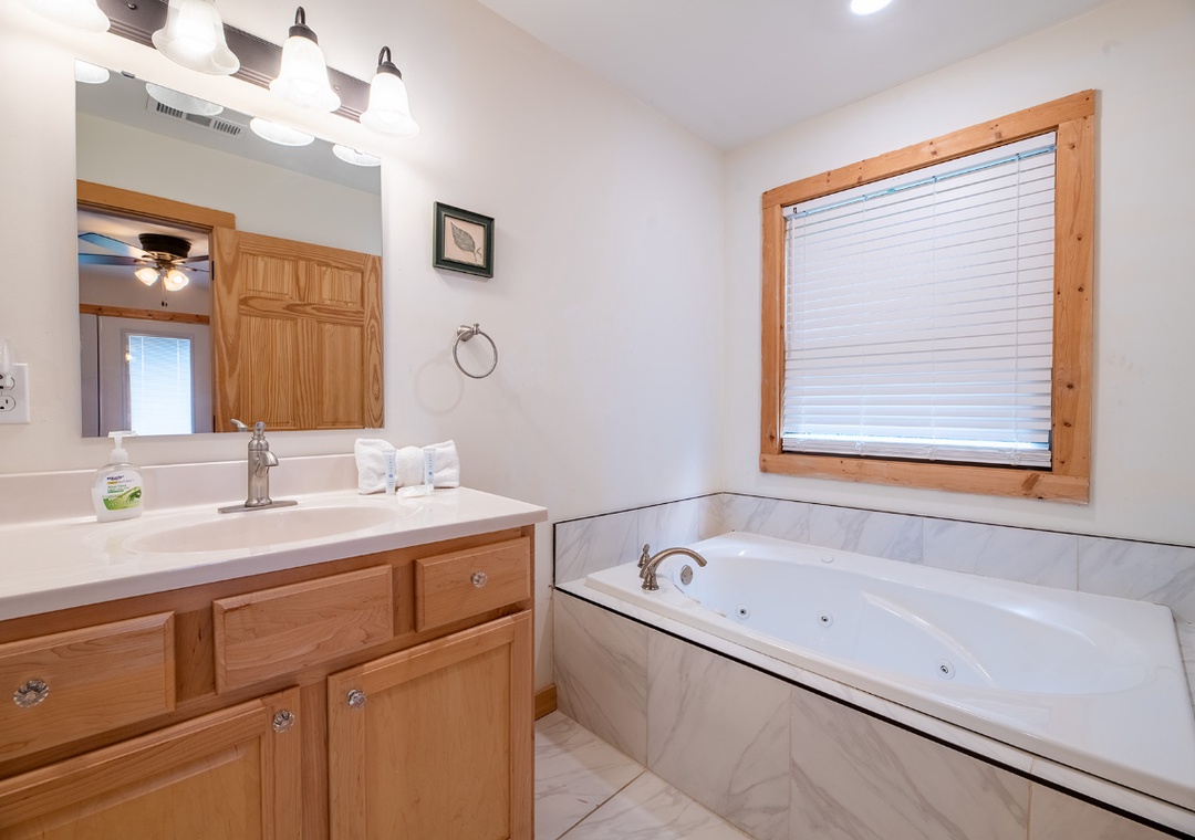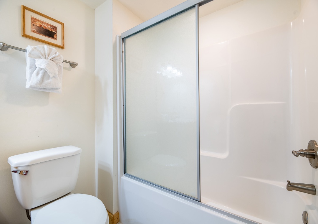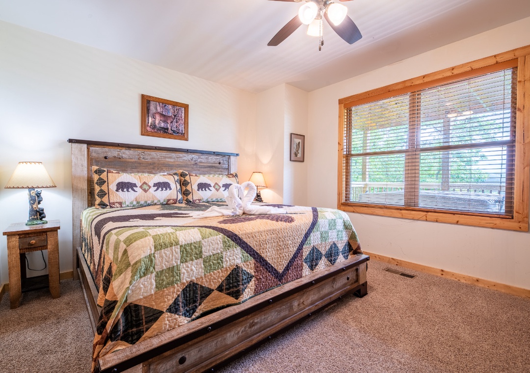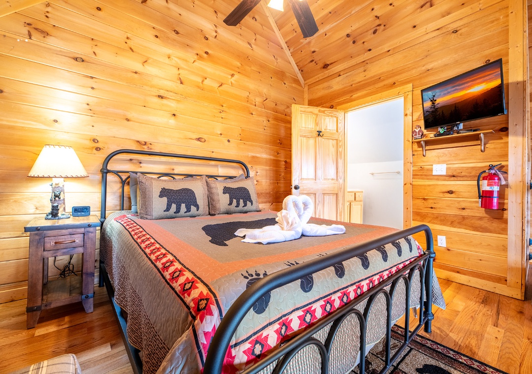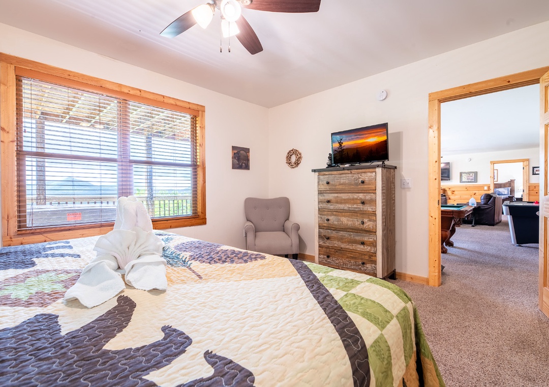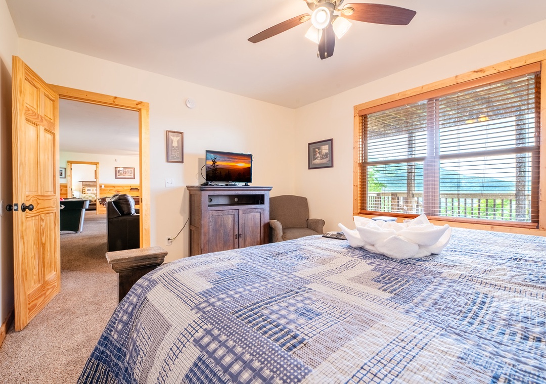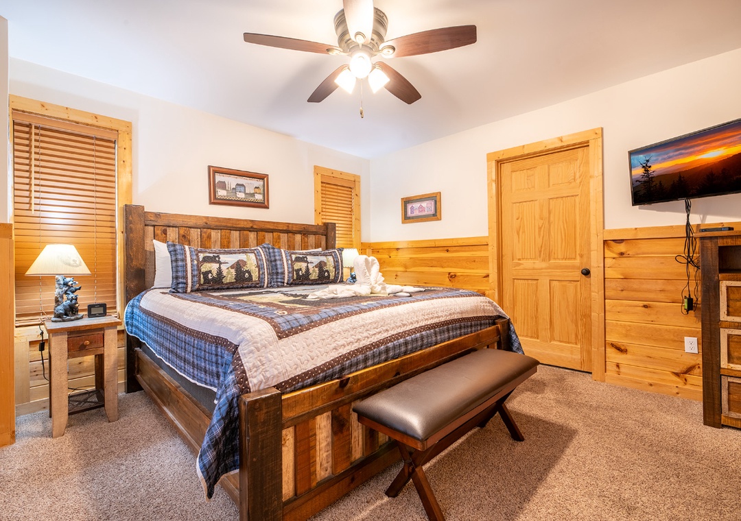 ✔ Bedroom #2 (Main Level): Cozy Bedroom with a King-sized Bed and a Flat-screen TV; Attached Full Bathroom with Shower/Tub Combo