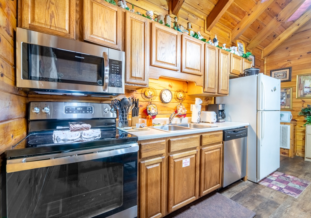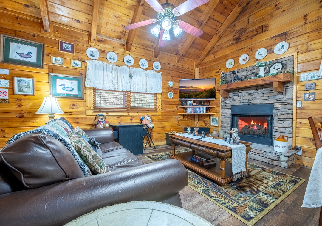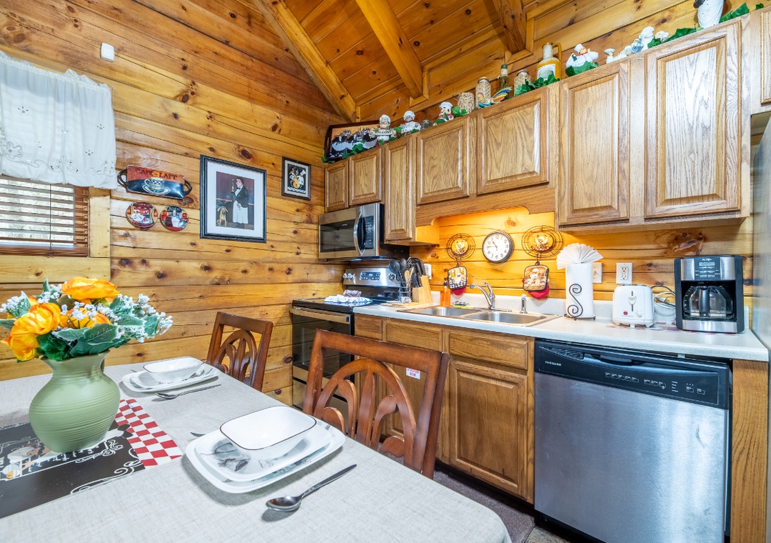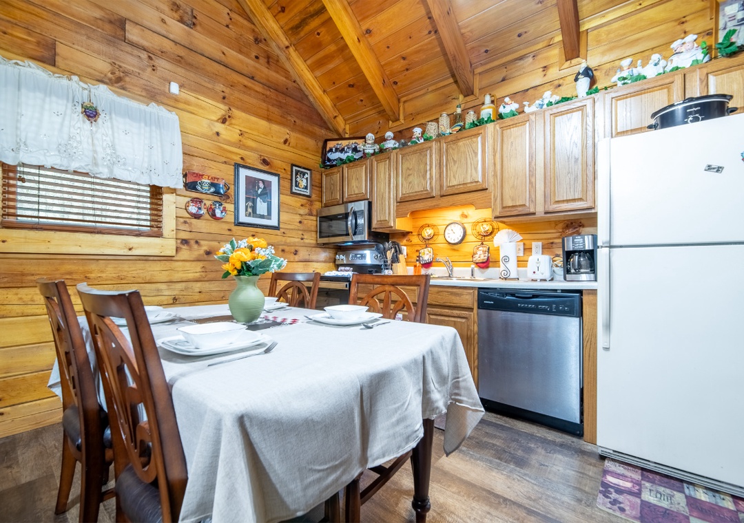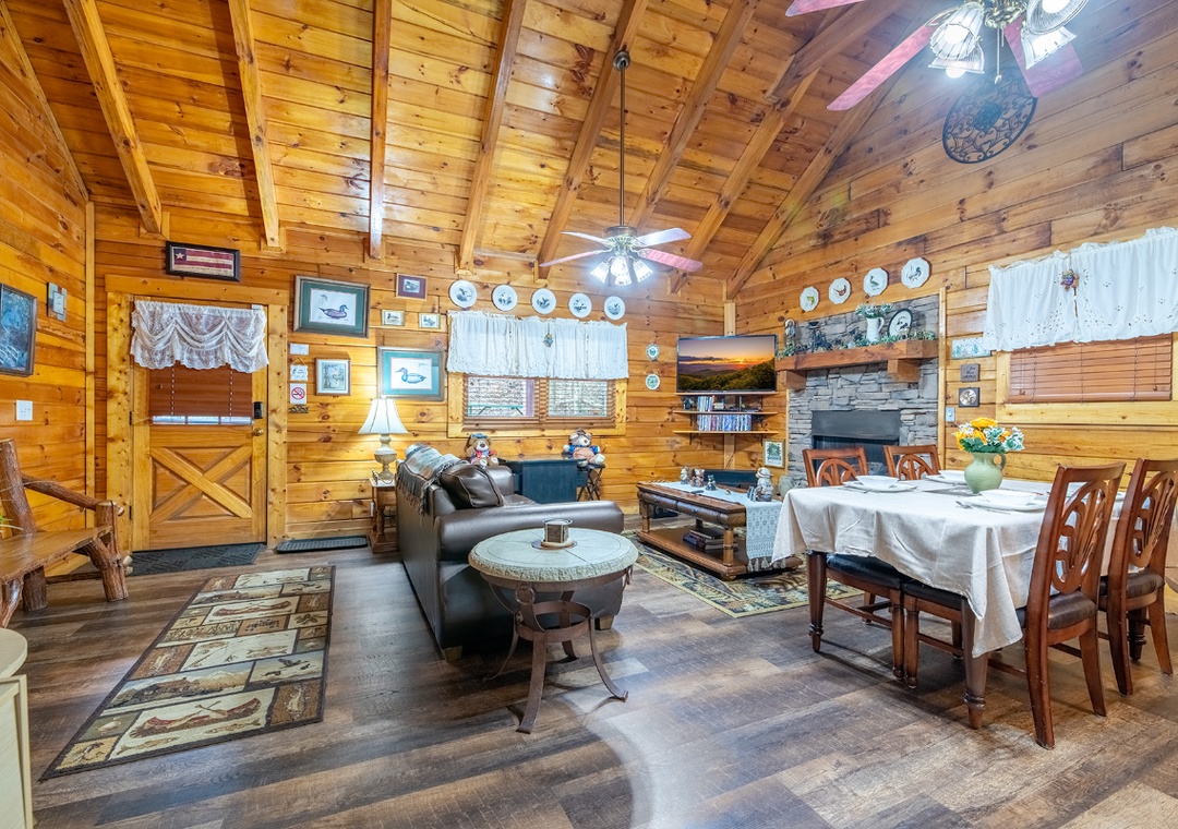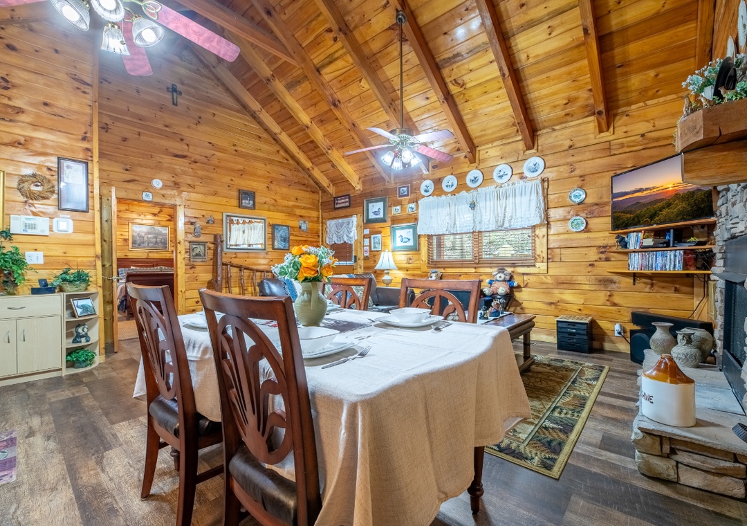 Inside, the living room boasts a glowing propane fireplace that sets the mood for quiet evenings and lazy mornings alike. Settle into the comfortable seating and enjoy your favorite movies or shows on the Roku TV, complete with a DVD player for classic movie nights. A multicade arcade system offers hours of nostalgic fun right from the comfort of the living room. It’s the perfect way to spend a cozy night in, rain or shine, without ever leaving the cabin. The open floor plan allows the living room to flow naturally into the dining area and kitchen, making it easy for everyone to stay connected. Free WiFi is also available throughout the property.