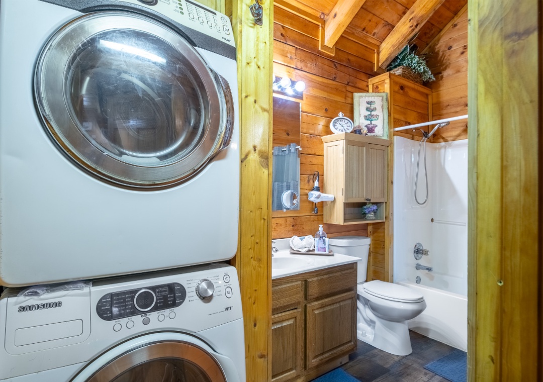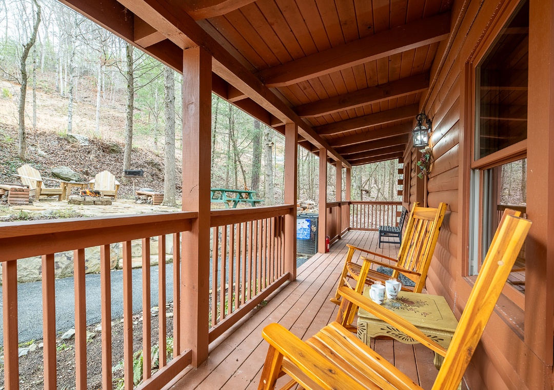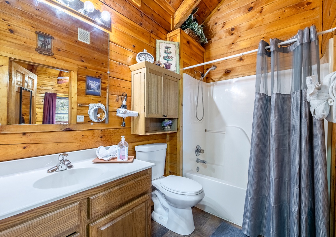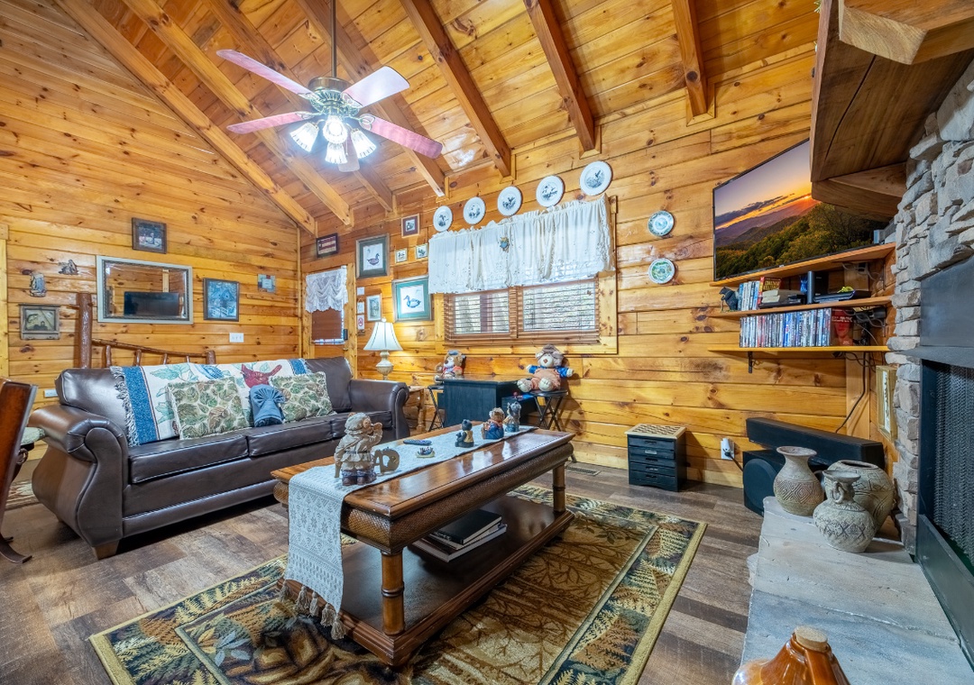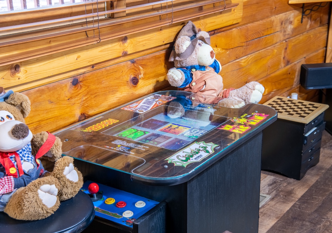 Inside the cabin, the entertainment begins the moment you walk through the door. The inviting living room is designed for relaxing nights in, featuring a Roku TV with a DVD player so you can stream your favorite shows, catch a movie, or enjoy a nostalgic DVD night. The multicade arcade system brings classic gaming excitement right into the cabin, perfect for friendly competition and reliving retro favorites together. On cooler evenings, light the propane fireplace and settle in for a cozy night of games, movies, and mountain ambiance. On the back deck, you’ll find your private hot tub waiting to soothe tired muscles after a full day of exploring. Challenge your partner to a game of cornhole and enjoy a little lighthearted competition surrounded by peaceful wooded views. Out front, fire up the park-style grill for a casual cookout before gathering around the wood-burning firepit to roast marshmallows and share stories under the stars. Starwood is also centrally located in Wears Valley, where you’re just minutes from the attractions and excitement of Pigeon Forge, Gatlinburg, and Sevierville. Spend your mornings exploring mountain trails, your afternoons enjoying shows and attractions, and your evenings soaking in the hot tub or relaxing by the fire back at your private cabin.