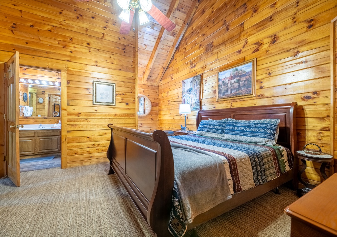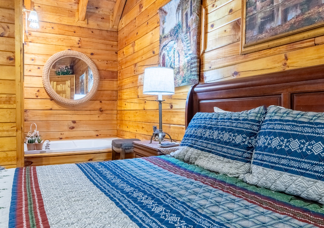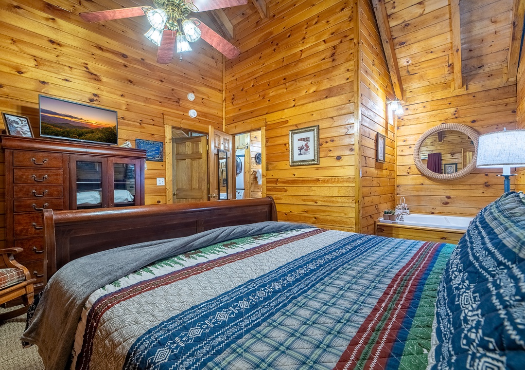 ✔ Bedroom 1 (Main Level): Relaxing Bedroom with a King-Bed and a flatscreen TV; Attached Full Bathroom with Shower/Tub Combo and Separate Jacuzzi