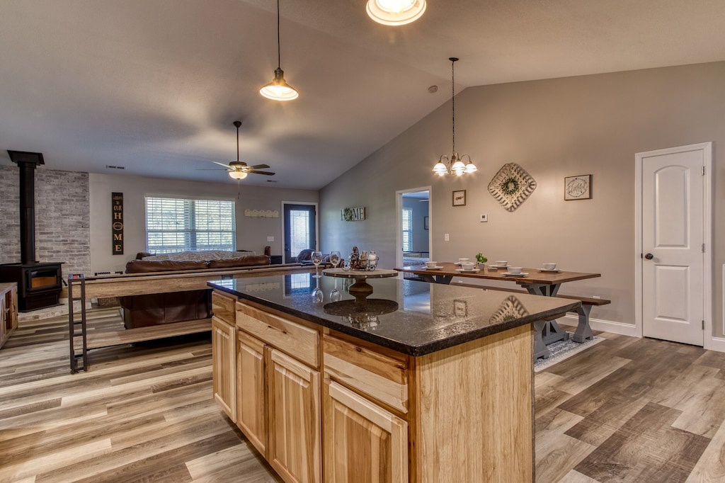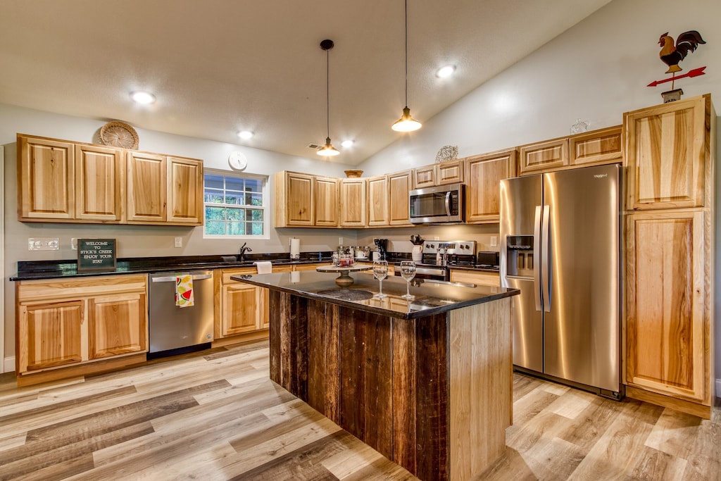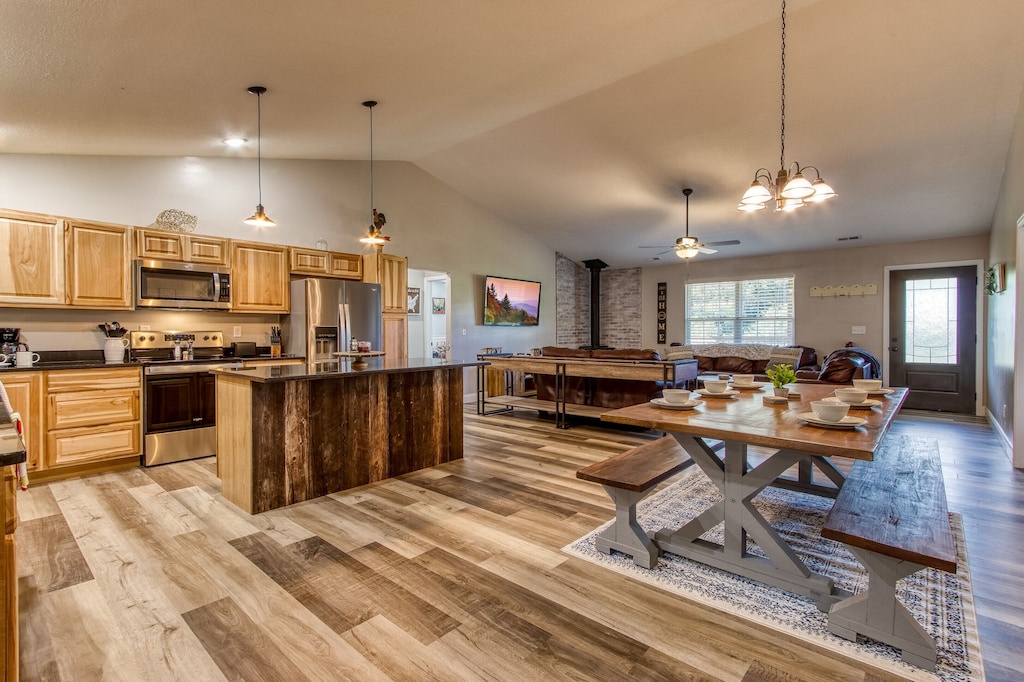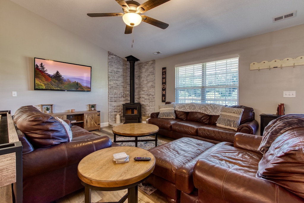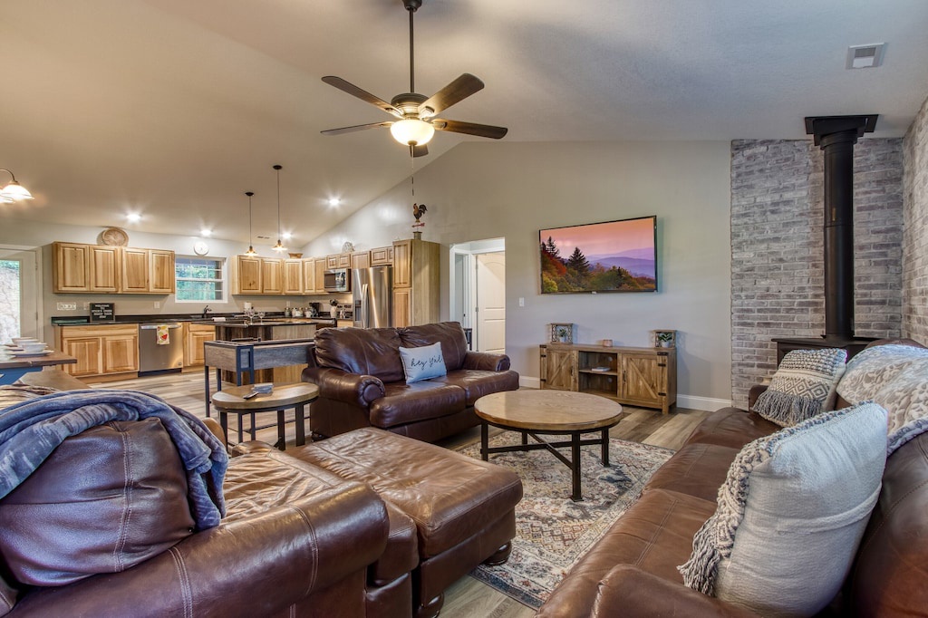 Newly built and furnished cabin, plush leather couches, smart TVs, indoor shuffleboard table, large open living room and dining room area, fully furnished kitchen