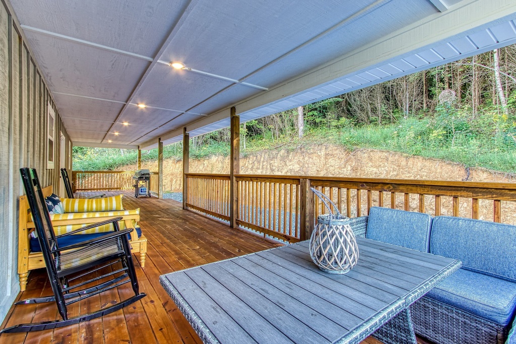 Outdoor hot tub; indoor shuffleboard table; outdoor fire pit with seating; gas BBQ grill, serene views; large backyard space; 11 acres of land to explore; large outdoor deck with rocking chairs, swing, and sectional couch; creek that runs through the property, which you can fish from; short 5 minute drive to Douglas Lake