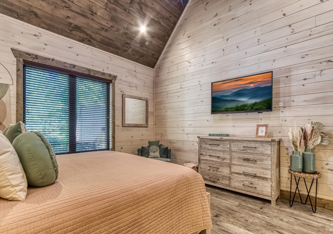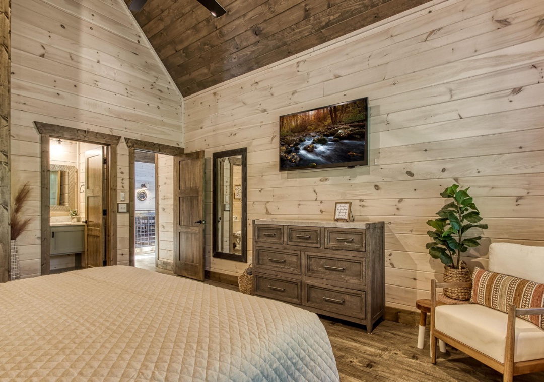 ✔ Bedroom #1 (Main Level): Spacious Bedroom with a King-sized Bed and Flat-screen TV; Attached Full Bathroom with Shower/Tub Combo