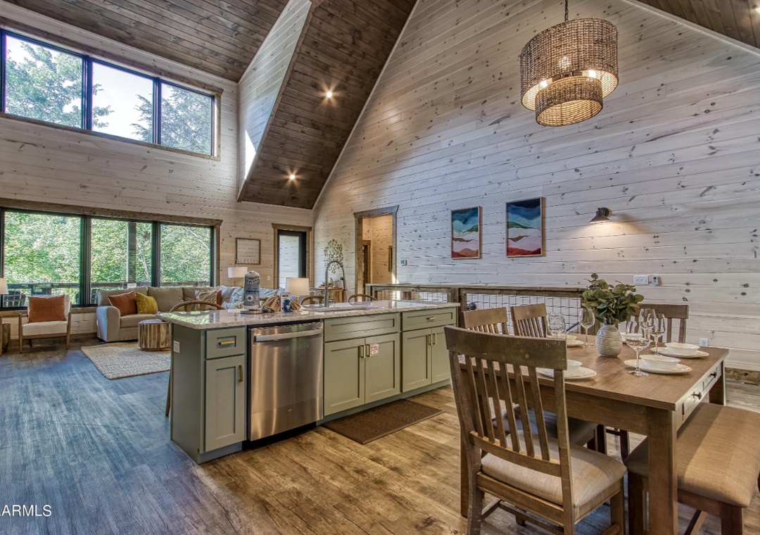The fully equipped kitchen is a dream for any home chef. It features modern appliances, granite countertops, and a kitchen island that make meal prep a breeze. Whether you're whipping up a quick breakfast before heading out to explore or preparing a delicious dinner for your group, you'll have everything you need at your fingertips. The open layout flows seamlessly into the dining area, allowing everyone to gather and enjoy meals together in style.