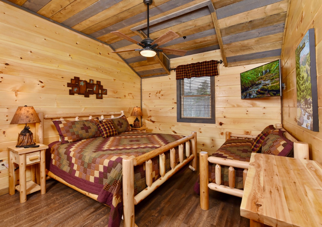 ✔ Mt. LeConte Room (Upper Level): Comfortable Bedroom with a King and Twin Bed and Flatscreen TV; Attached Full Bathroom with Shower/Tub Combo