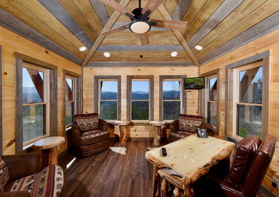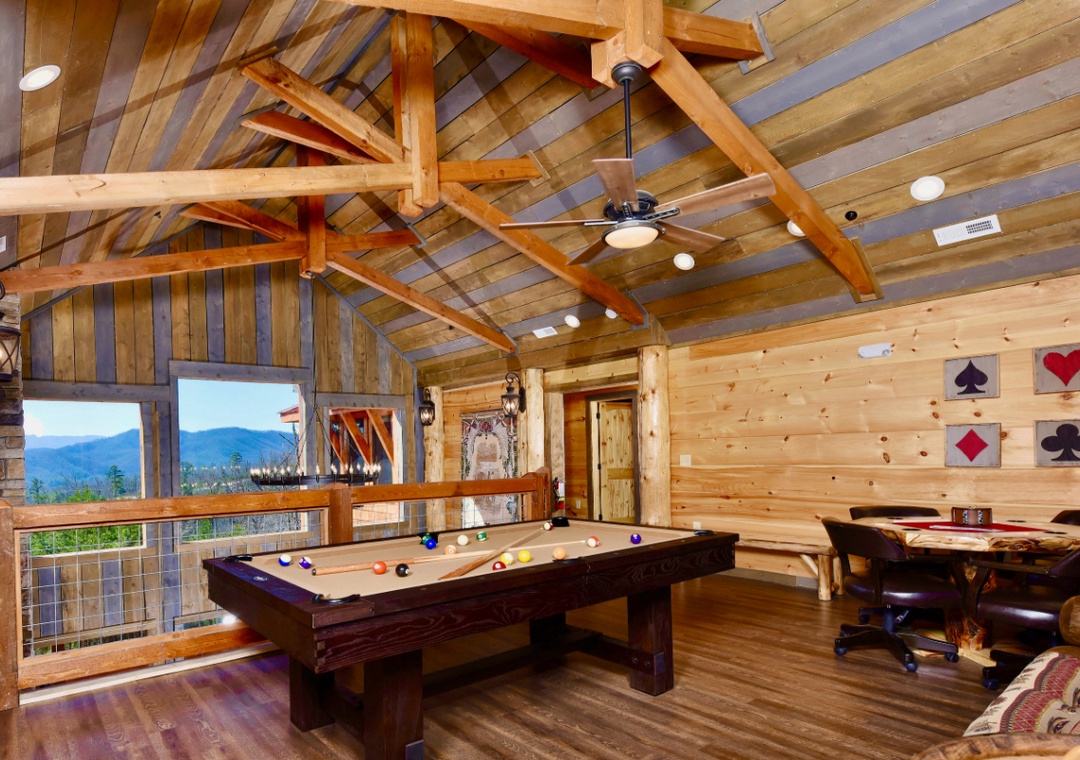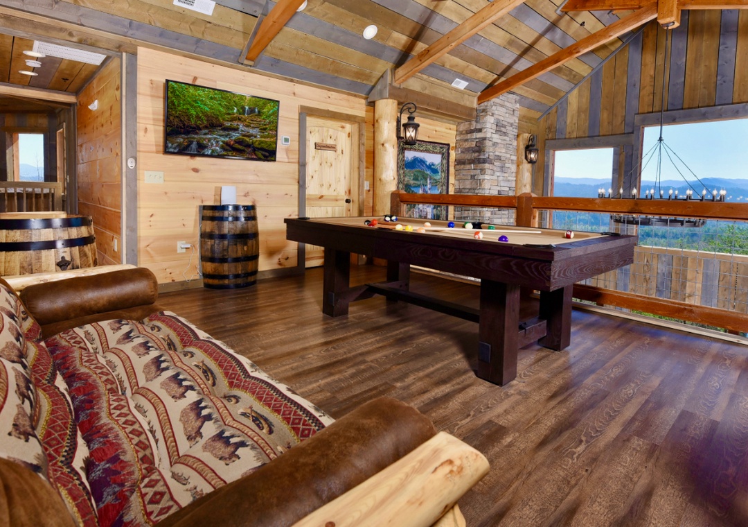 Step into the heart of Summit Castle and you’ll find a spacious living room designed for gathering and unwinding. A beautiful fireplace sits at the center of the room, anchoring the space with warmth, while a large flatscreen TV offers entertainment for movie nights or game-day watching. Massive windows showcase the panoramic mountain scenery, filling the room with natural light and creating a stunning backdrop for your stay. With the lodge's open floor plan, the atmosphere is both open and inviting, making it easy for groups to come together and enjoy the comfort of the lodge’s thoughtful design. Two game areas await in the loft and downstairs, ready to keep you entertained with hours of fun. Downstairs also boasts a state-of-the-art theater room for your movie nights or just catching up with your favorite series. Free WiFi is also available throughout the property.