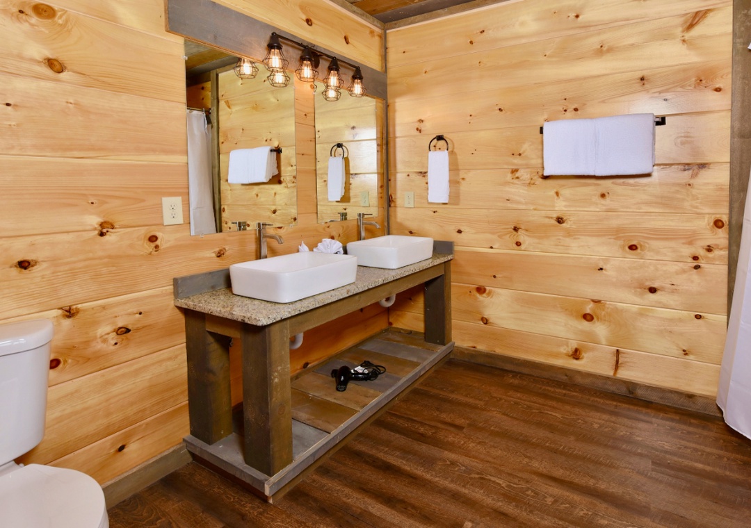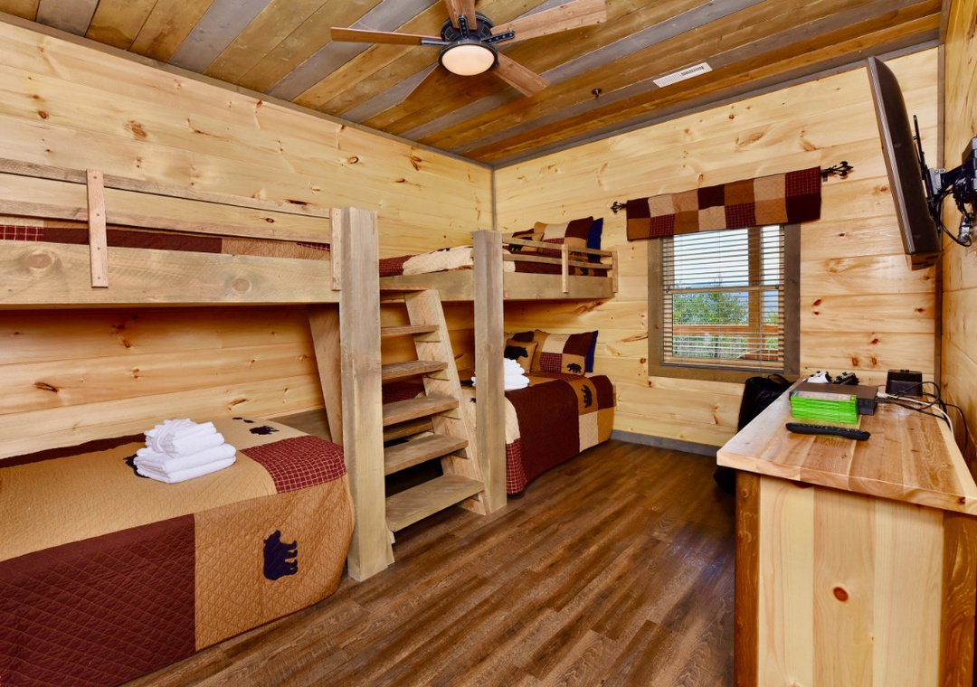✔ Park Room (Lower Level): Inviting Bedroom with 2 Full-over-Full Bunk Beds and Flatscreen TV; Attached Full Bathroom with 2 Stand Up Showers and 2 Toilets