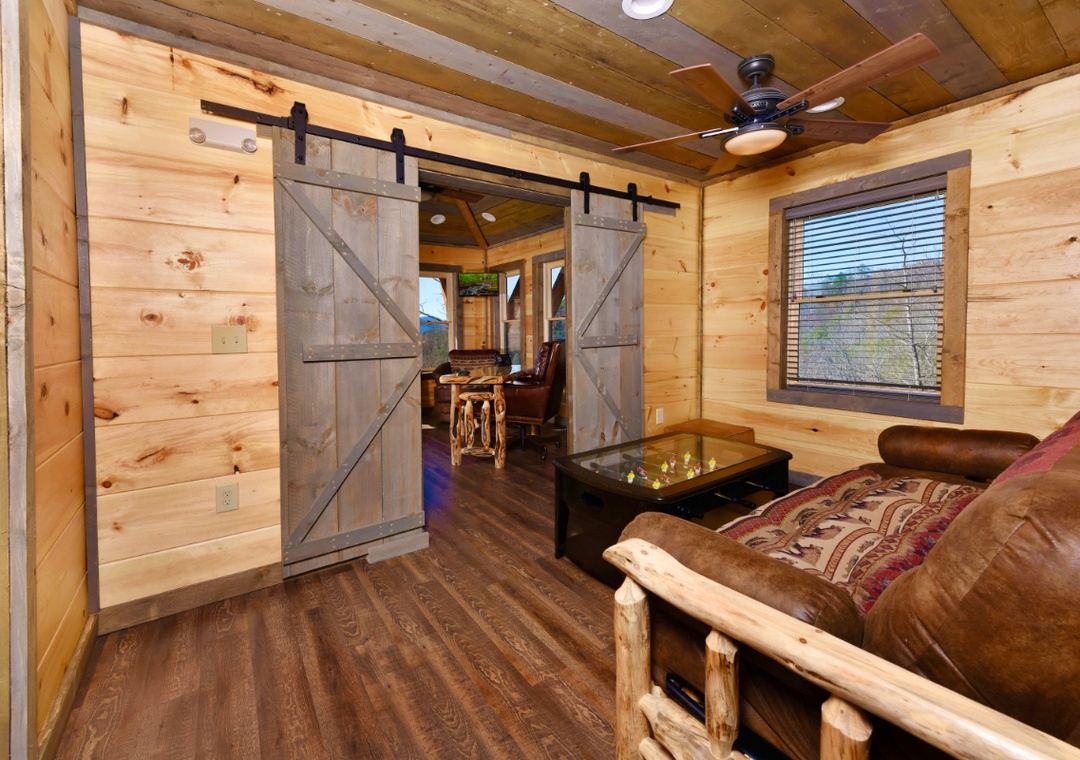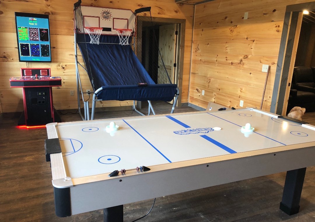 Summit Castle is packed with entertainment options that bring joy to everyone and keep the fun going no matter the weather. The dedicated theater room features true cinema-style seating and an enormous 85" Sony Google TV with Cable Box and BluRay Player, perfect for movie marathons or watching your favorite shows in comfort. Just outside the theater awaits the game room, complete with an indoor basketball game, an air hockey table, and a classic arcade machine, providing hours of friendly competition. On the upper level, a loft game area expands the possibilities even further with a pool table, poker table, foosball, and a cozy seating area that overlooks the mountains through large windows. There is also a dedicated home office on this level, perfect for remote work or catching up on emails. The views alone make the loft a favorite gathering spot, allowing you to enjoy games, laughter, and breathtaking scenery simultaneously. Outdoors, the spacious decks offer peaceful spaces to relax, while the hot tub on the lower-level deck provides the ultimate way to unwind beneath the stars after a full day of exploring or playing. On the back side of the property, a propane fire pit awaits, offering the perfect spot to unwind in the evenings while enjoying the peaceful surroundings.