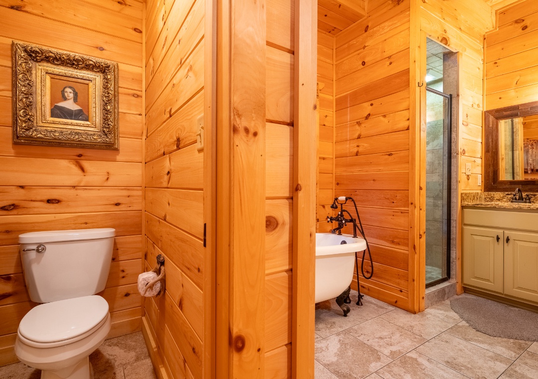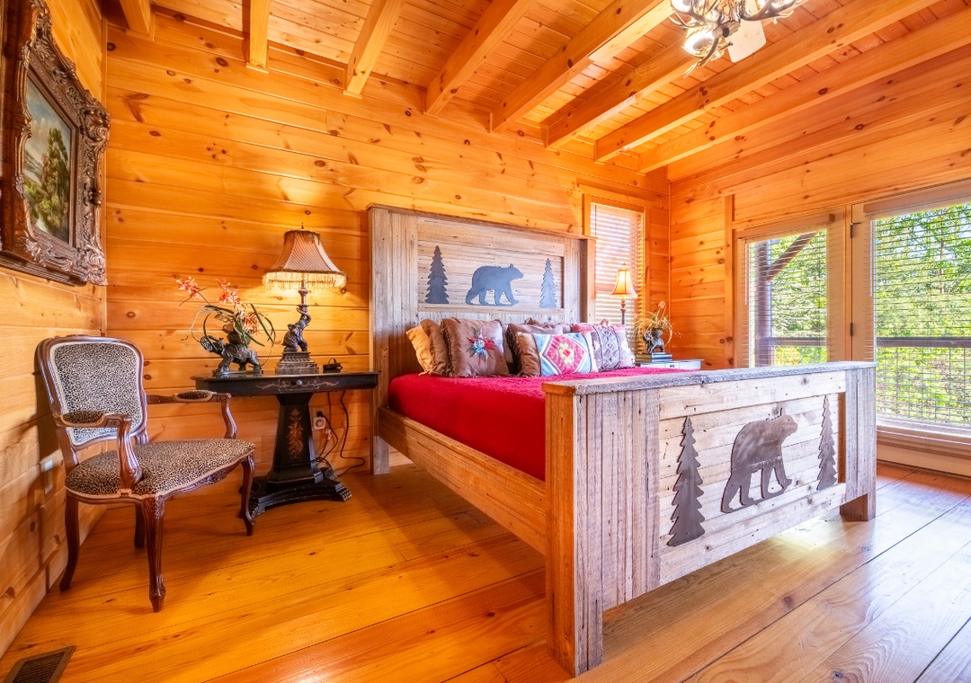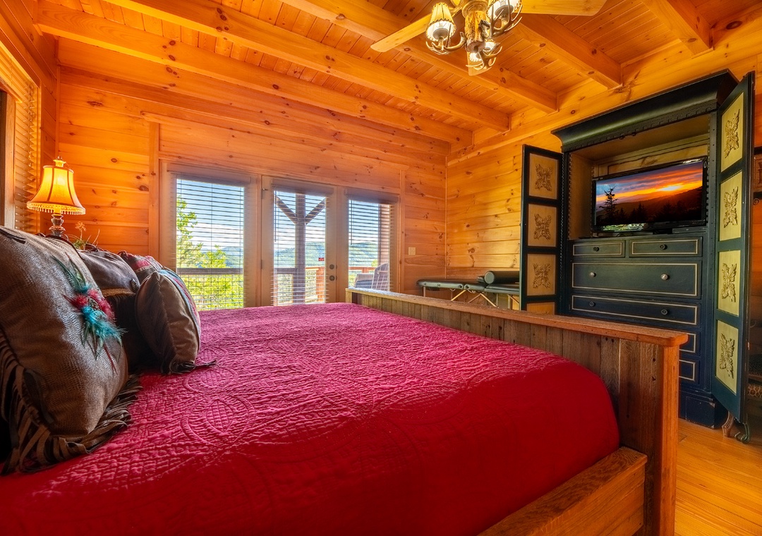 ✔ Bedroom #1 (Main Level): Amazing Master Bedroom with a King-sized Bed, Flat-screen TV, and access to a Relaxing Porch; Attached Full Bathroom with Stand Up Shower and Separate Soaker Tub