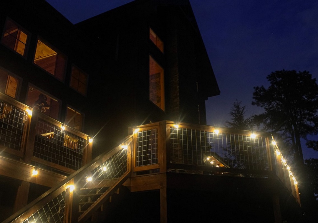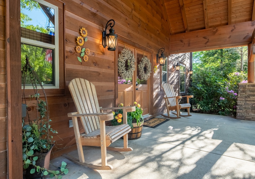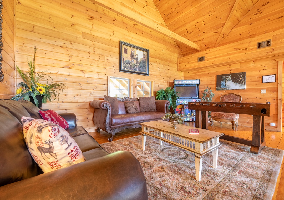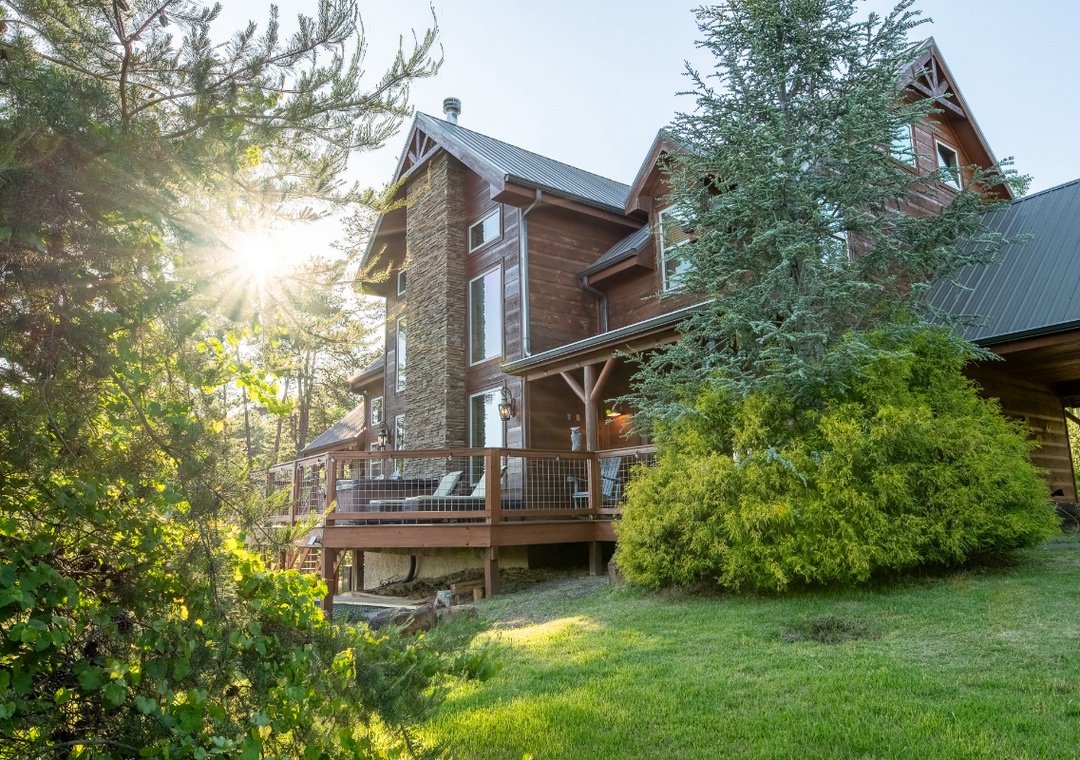 Step inside and let the entertainment begin. The main living room sets the tone with its impressive wood-burning stone fireplace that creates a warm and inviting space to gather. For movie buffs and binge-watchers, the 65” Sony Smart TV with a DVD player ensures access to all your favorite shows, films, and streaming services. Just off the main entrance, you’ll find a dedicated home office ideal for sneaking in a little work or quiet reading time. But when it’s time to let loose, head upstairs to the expansive loft where you’ll find a Pandora Box Arcade system loaded with hundreds of retro games. Next to it, a full-sized foosball table stands ready for fast-paced matches that will bring out your competitive side. Step outside to discover a wealth of outdoor options, starting with the inviting back deck featuring a private hot tub. Surrounded by the sights and sounds of nature, the hot tub is the perfect place to relax after a long day of hiking, shopping in town, or exploring local attractions. On the side deck, things heat up again with a second wood-burning fireplace. It’s in an open-air lounge area which is tailor-made for cool evenings filled with good company, cozy blankets, and maybe a glass of wine or a mug of hot chocolate. At night, the lodge glows under thoughtfully placed exterior lighting, creating a welcoming ambiance and allowing you to enjoy the outdoor spaces long after the sun goes down.