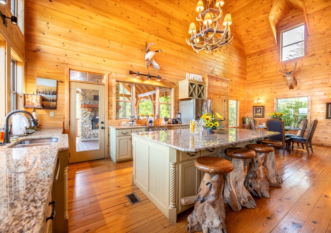 The fully-equipped kitchen boasts modern amenities, making it easy to prepare delicious meals for your family or friends. Well-appointed with a full-sized refrigerator, dishwasher, stove, microwave, and other kitchen appliances perfect for making breakfast, lunch, or dinner throughout your stay! All pots, pans, glasses, plates, silverware, etc., are also there for you! Gather around the inviting dining table or the nearby breakfast bar to share stories and laughter, as it invites you to savor each bite while taking in the natural beauty of the surroundings.