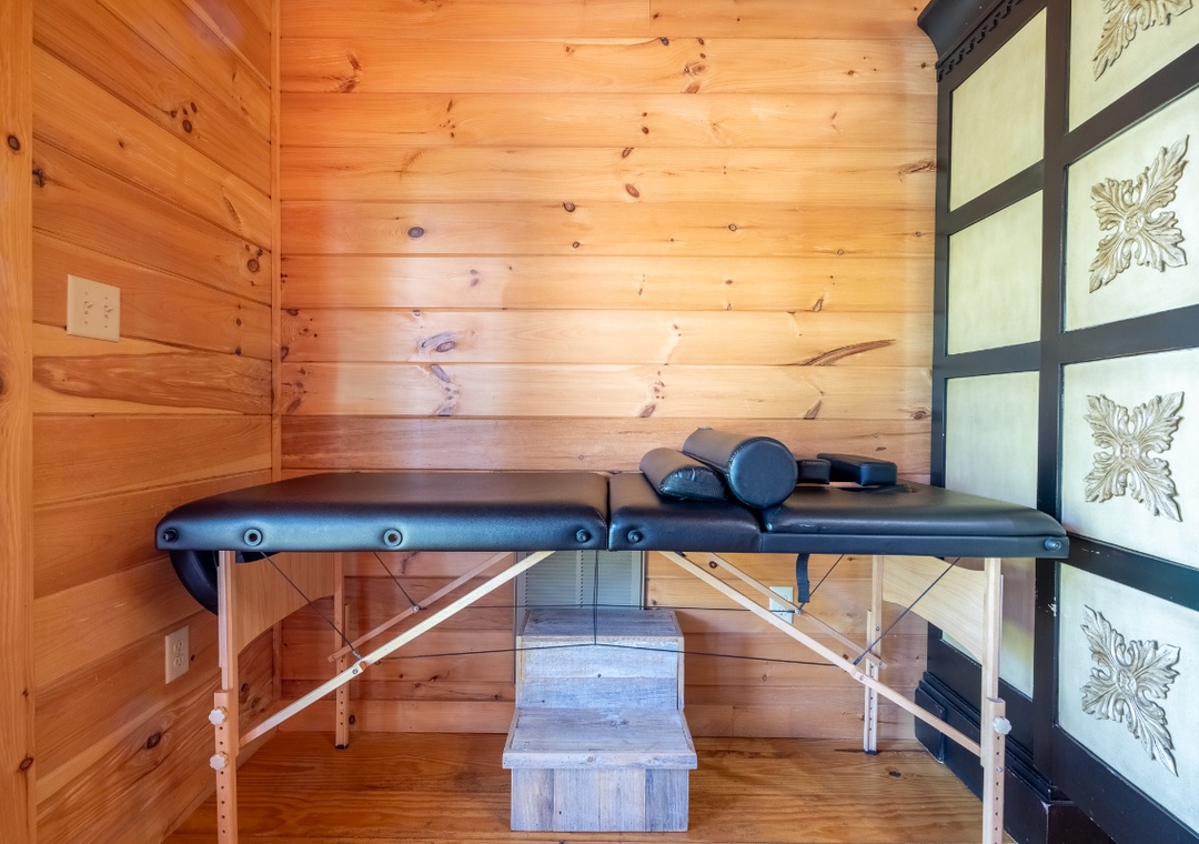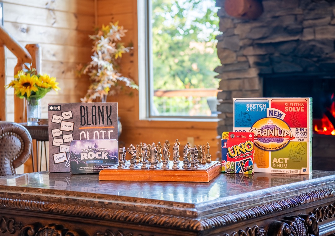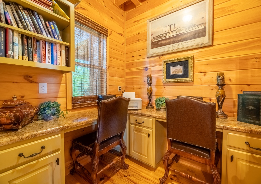 Inside, the lodge is designed with both comfort and function in mind. One of the standout features is the thoughtfully curated lending library, perfect for curling up with a good book on a quiet afternoon. A dedicated games closet also stands ready, stocked with classic board games and puzzles for endless entertainment. You'll also find a massage table offering a sweet spot for in-home relaxation. At the center of it all, a grand stacked-stone wood-burning fireplace anchors the room, offering a timeless place to gather. A 65” Sony Smart TV with a DVD player and a well-stocked DVD library completes the space, turning the living area into a home theater on demand. To the right of the main entrance, a dedicated home office provides a peaceful, private space for work or study, fully equipped with a wireless printer and shredder. The open-concept kitchen and dining area extend the welcoming atmosphere, offering a central hub for meals, conversation, and shared moments. You can also go upstairs and find the game loft, which brings a playful twist to indoor living, offering a space that blends relaxation with entertainment. Free WiFi is also available throughout the property.