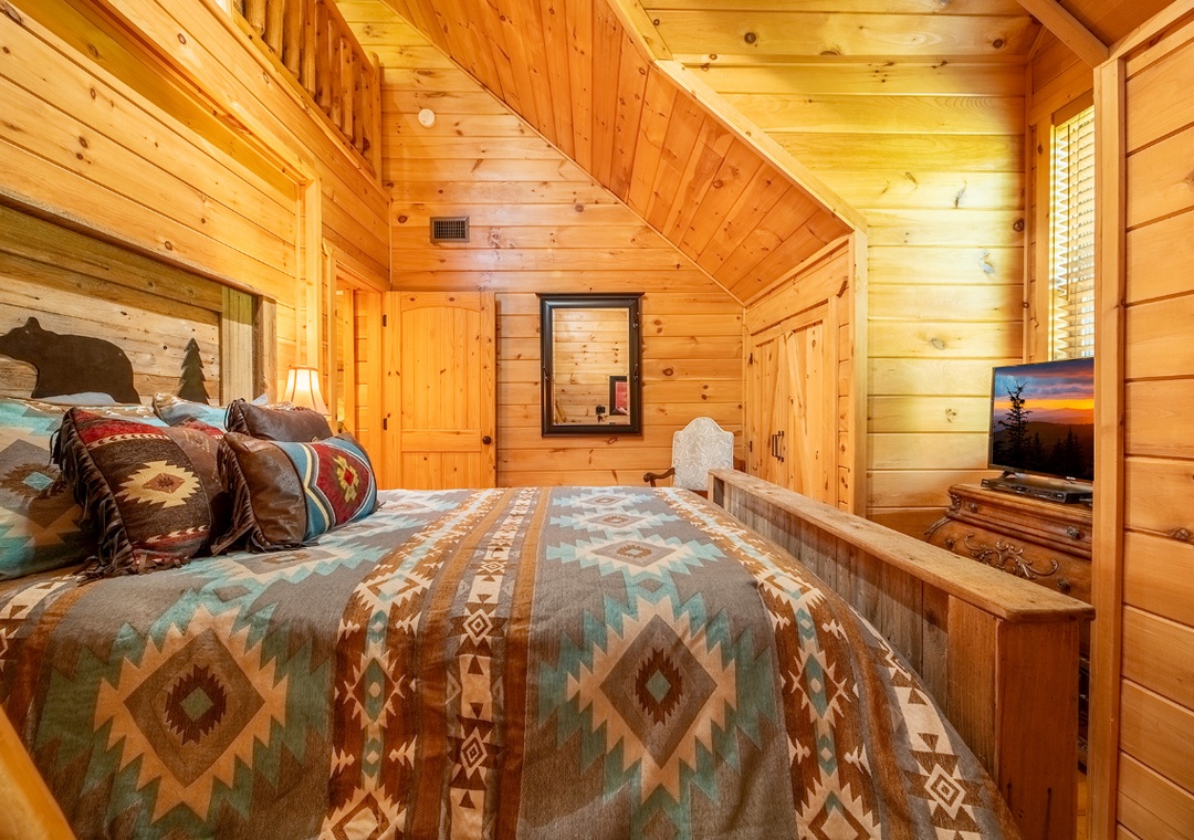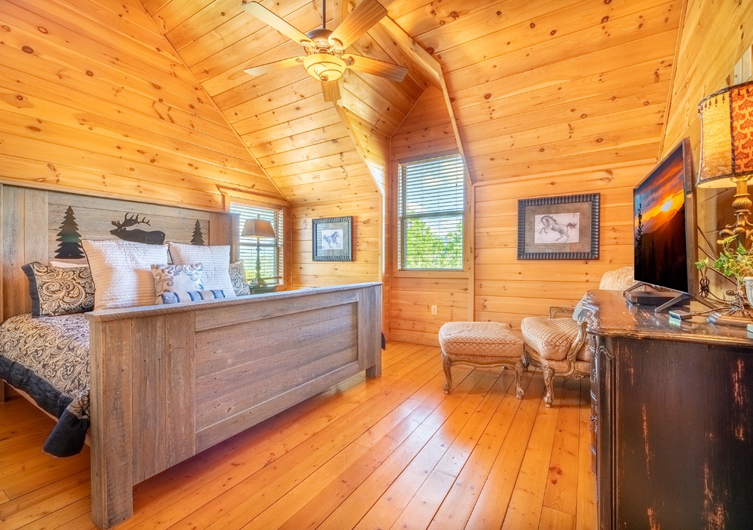✔ Bedroom #2 (Upper Level): Comfy Bedroom with a King-sized Bed and a Flat-screen TV; Access to a Full Bathroom with Shower/Tub Combo