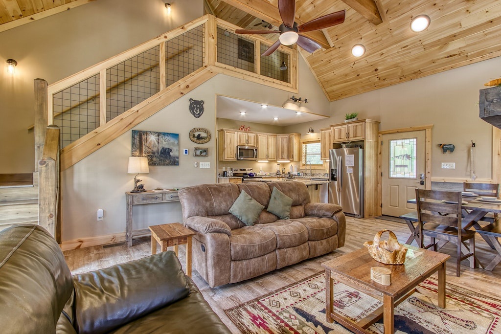 Sunrise Chalets living room is designed for both entertainment and relaxation. Youll find a large smart TV situated above the gas fireplace for cozy nights, and plush couches centered below the cathedral ceilings. Whether you are snuggling up in front of the fire or watching a movie in the comfort of your home-away-from-home, you will be delighted in comfort.