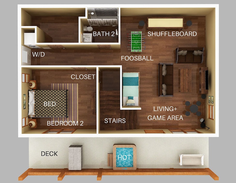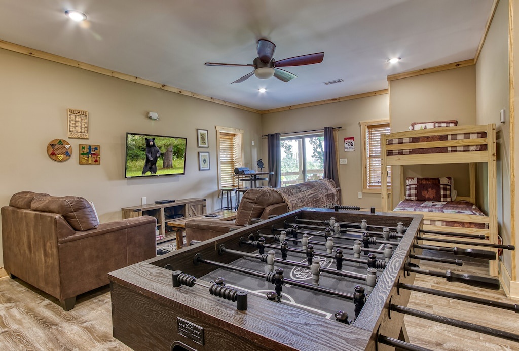 While relaxation and comfort abound throughout Sunrise Chalet, the downstairs game room was designed for family fun! If hours of competition between rounds of foosball games or shuffleboard competitions dont keep you busy enough, more fun awaits you outdoors! You and your guests can relax in the private hot tub, whip up dinner on the outside grill, play a round or two of corn-hole, or enjoy the community outdoor seasonal pool for a daytime dip! And to wind down your day, enjoy a hot cup of tea (or moonshine!) while relaxing on the decks and taking in the scenic views and sounds of the Smokies.