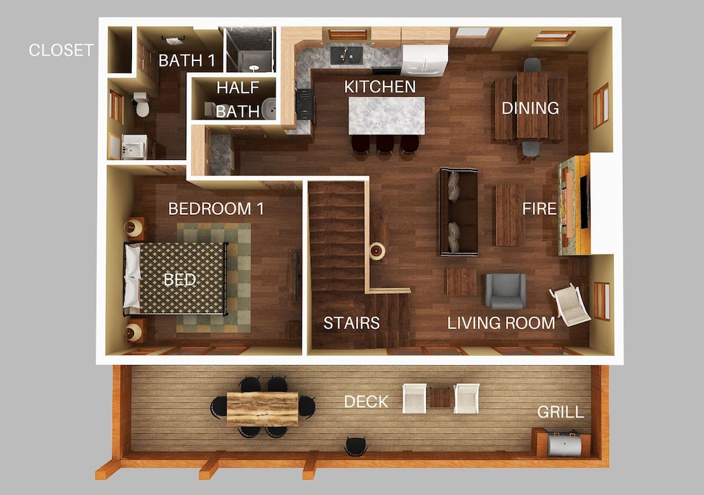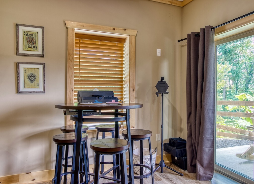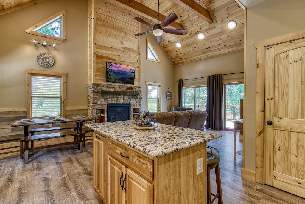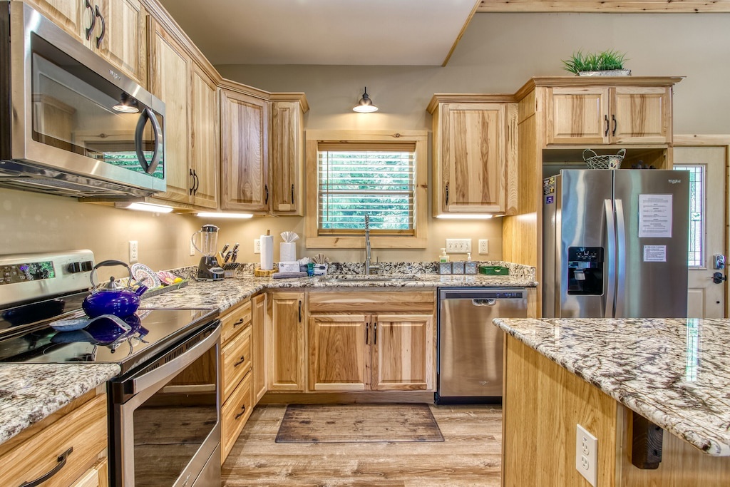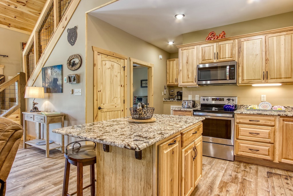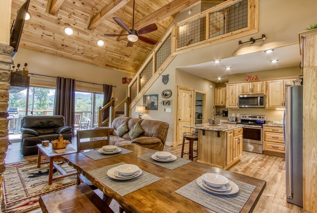 Meals are an important aspect of every vacation, and while the area offers a multitude of restaurants for every culinary craving, if you never want to leave the house to eat, you certainly dont have to! Sunrise Chalet offers a fully equipped kitchen complete with everything you need to prepare your own farm-to-table meal, including a standard size refrigerator, oven, stove, toaster, pots, pans, and cutleries. With an open design, granite countertops, stainless steel appliances, plenty of counterspace, and a large island with additional seating, theres room to whip up a meal and enjoy it right here in the comfort of your own cabin. The dining area is situated right off the kitchen, with seating large enough to gather and enjoy your meals comfortably.