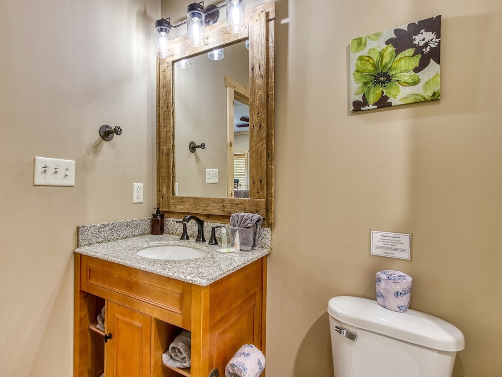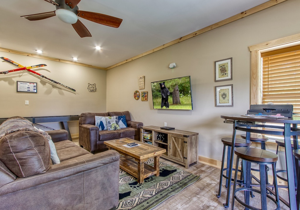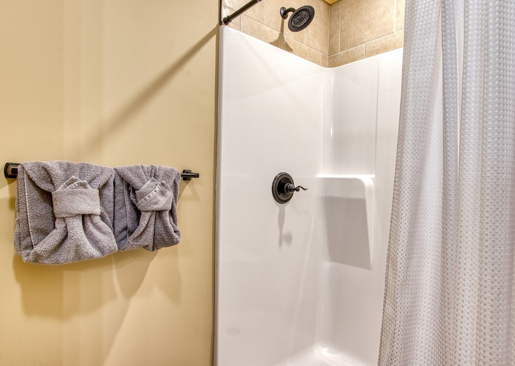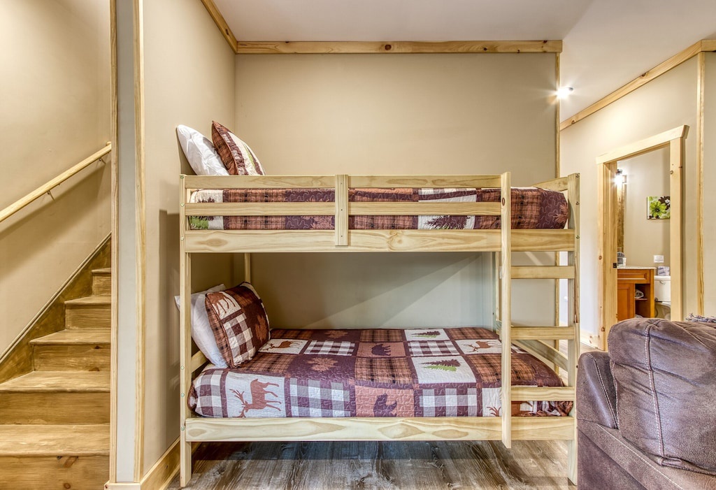You will never feel cramped here at Sunrise Chalet. Both the main and upper levels will welcome you to large king-sized beds, both situated with built-in electric fireplaces, TVs, and ceiling fans. The lower-level bedroom has a Queen-sized bed, which also has its own electric fireplace in the bedroom as well. The game room is perfect for your kiddos (or guests that are young at heart), with a twin-over-twin bunk bed. And you can pack light, because all three full-sized bathrooms contain towels and starter soaps, shampoos, toilet paper, and other bathroom essentials needed to start your vacation off on the right foot!