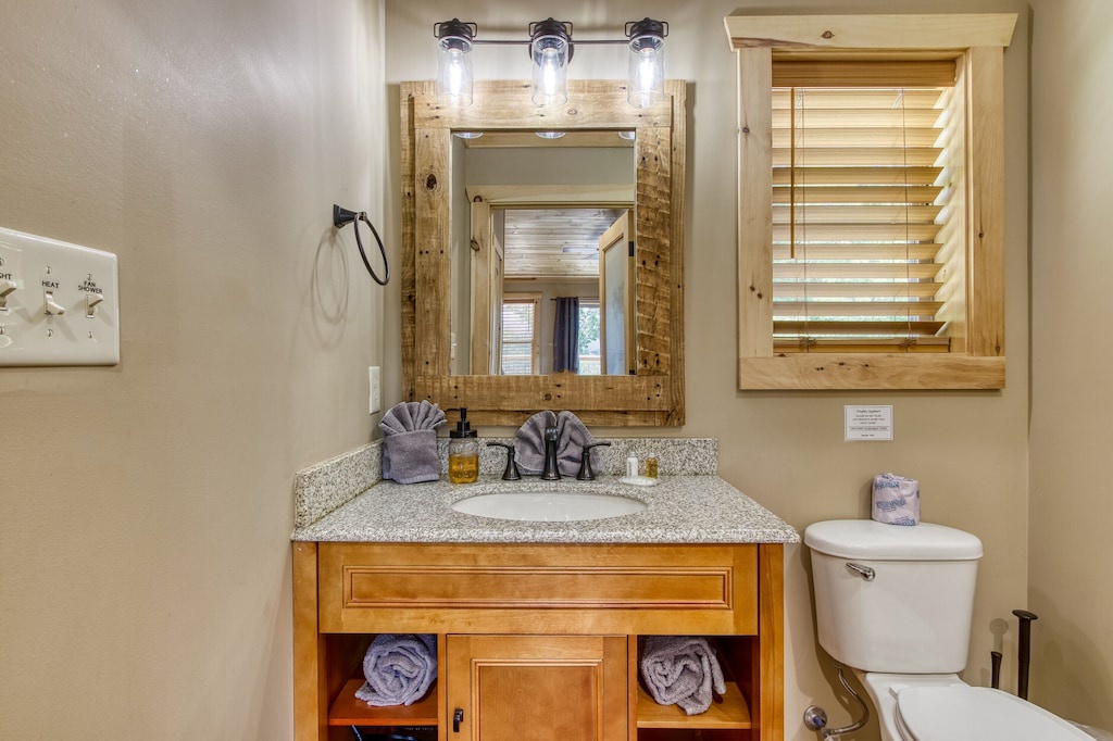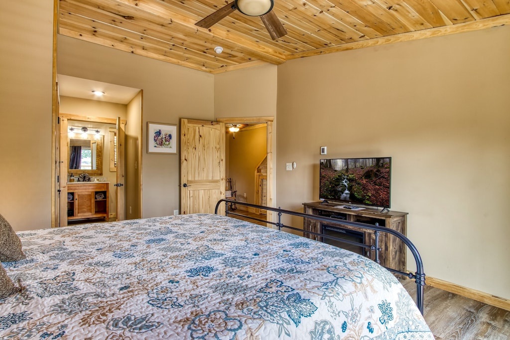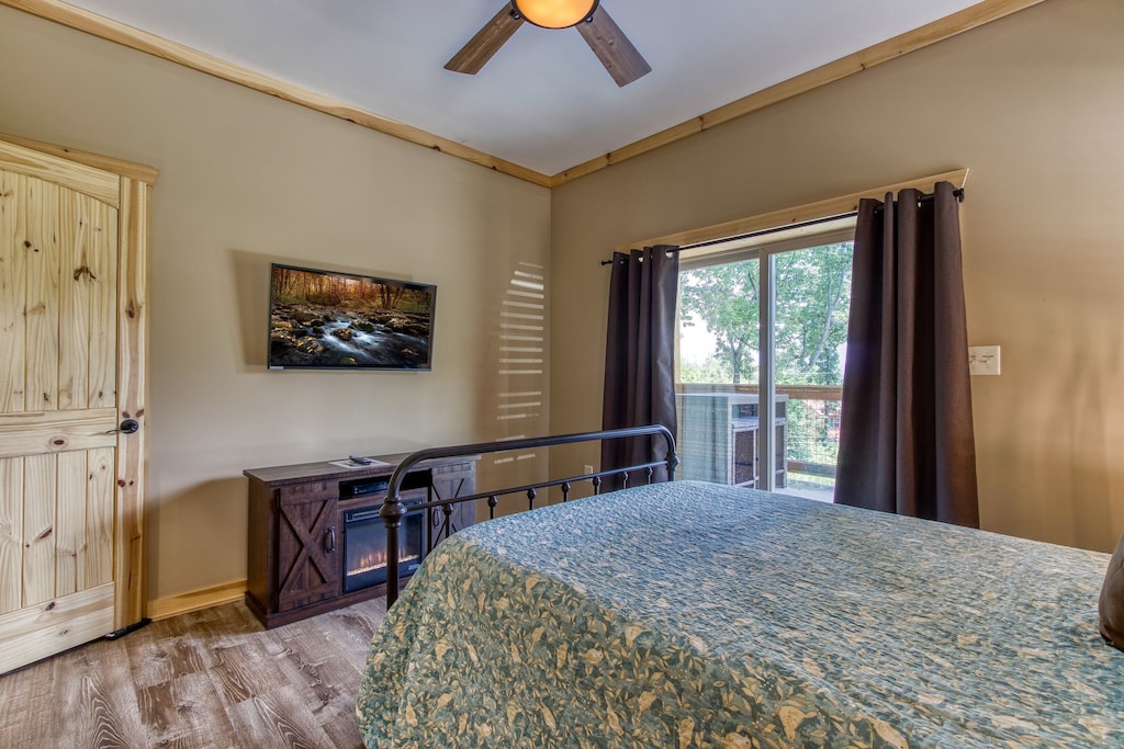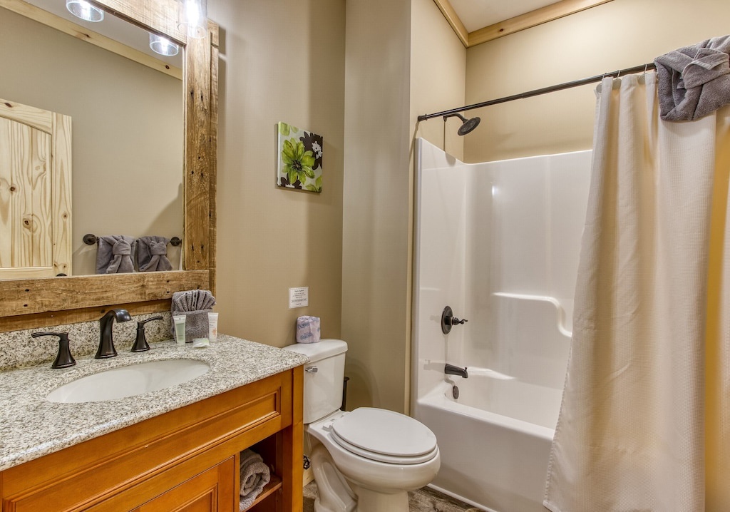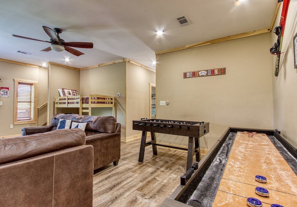You will never feel cramped here at Sunrise Chalet. Both the main and upper levels will welcome you to large king-sized beds, both situated with built-in electric fireplaces, TVs, and ceiling fans. The lower-level bedroom has a Queen-sized bed, which also has its own electric fireplace in the bedroom as well. The game room is perfect for your kiddos (or guests that are young at heart), with a twin-over-twin bunk bed. And you can pack light, because all three full-sized bathrooms contain towels and starter soaps, shampoos, toilet paper, and other bathroom essentials needed to start your vacation off on the right foot!