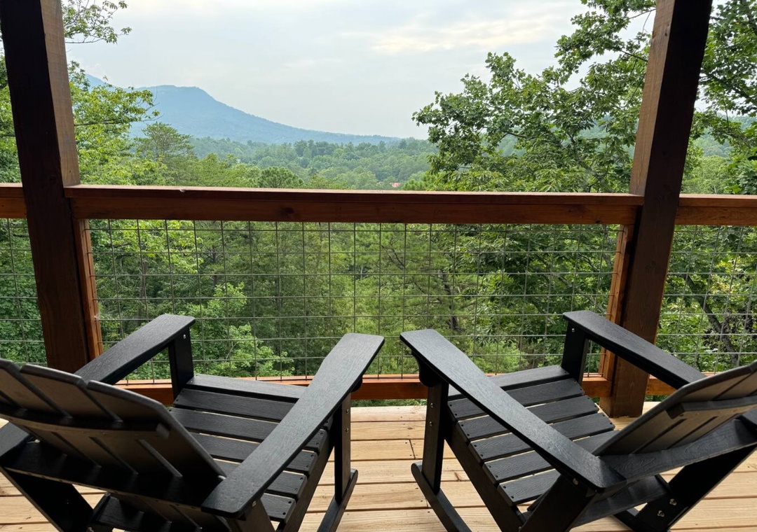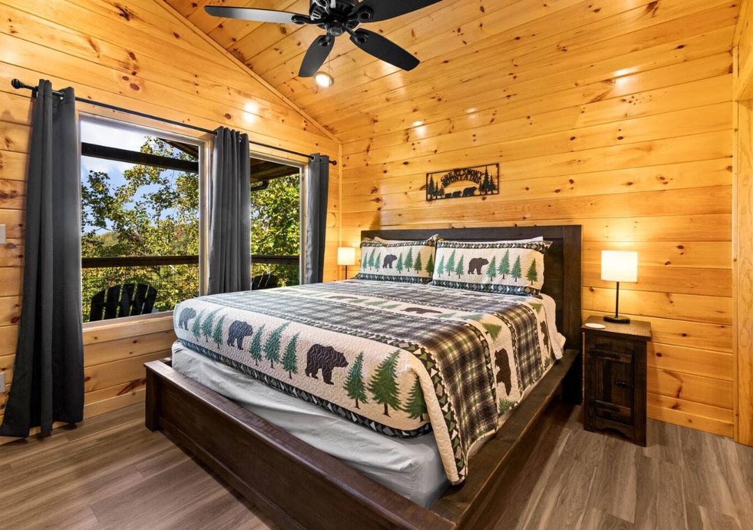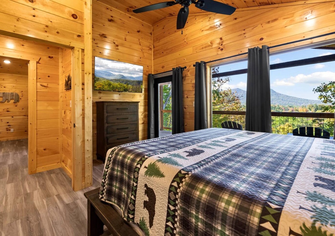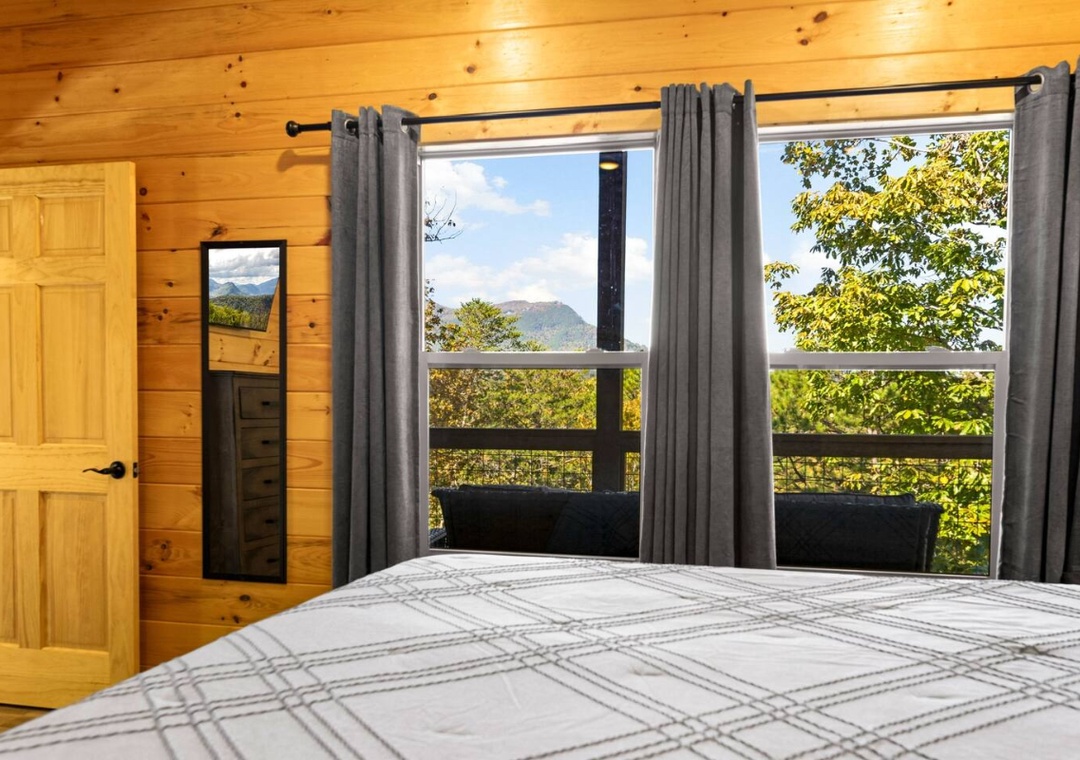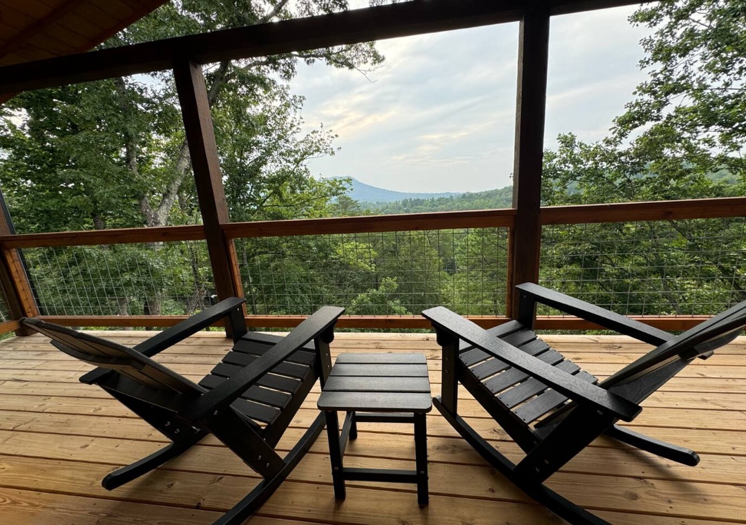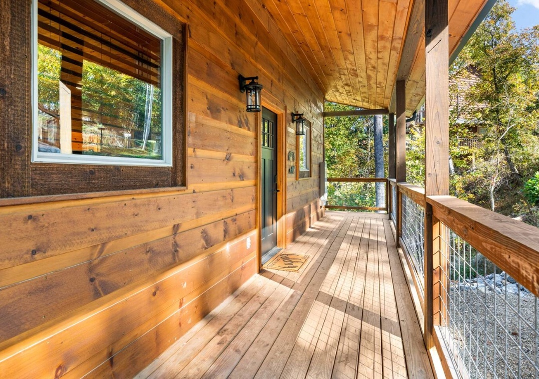 There are two king suites and one queen bunkbed suite in the cabin. There’s a sleeper sofa for additional sleeping space if needed. One king suite is located on the main level and has a walk-in shower in the en suite bathroom. All bedrooms have a view of Bluff Mountain and the two bedrooms on the upper level have private access to the top deck.