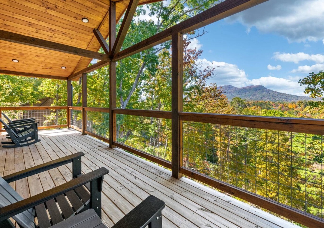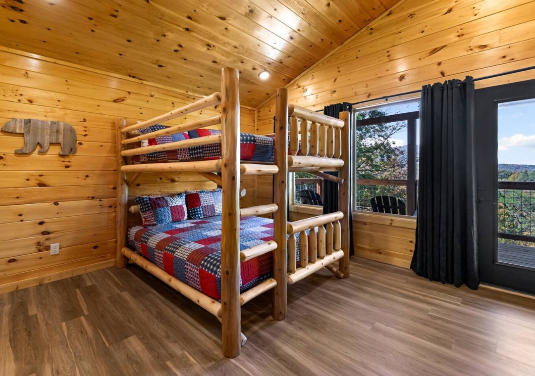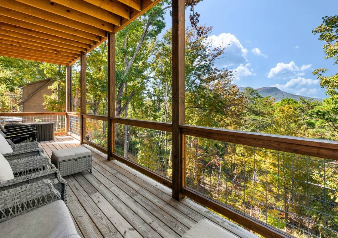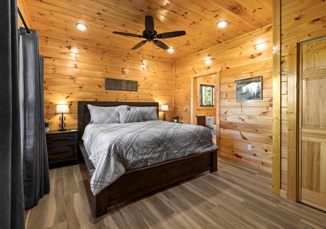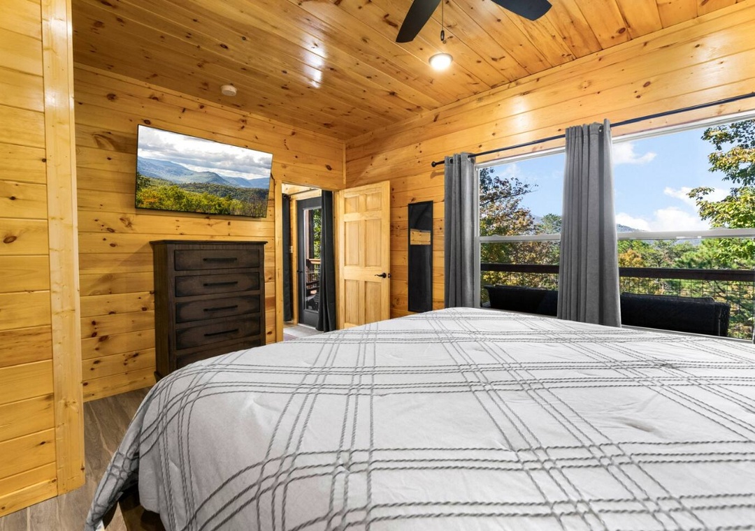 There are two king suites and one queen bunkbed suite in the cabin. There’s a sleeper sofa for additional sleeping space if needed. One king suite is located on the main level and has a walk-in shower in the en suite bathroom. All bedrooms have a view of Bluff Mountain and the two bedrooms on the upper level have private access to the top deck.