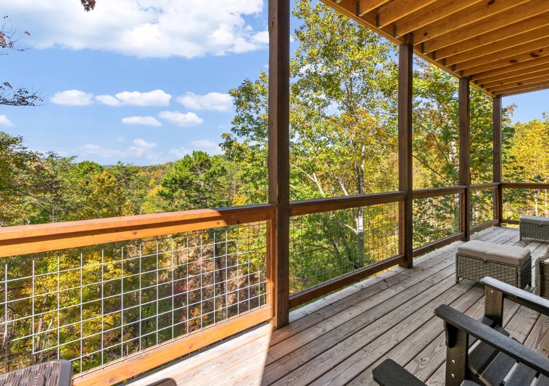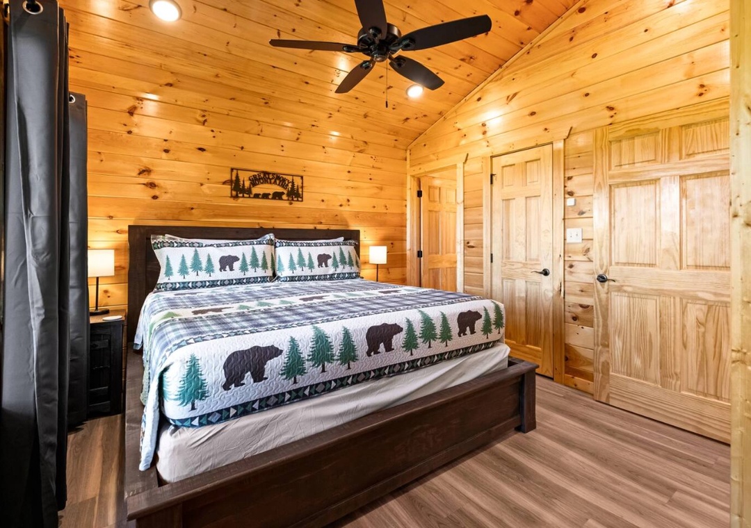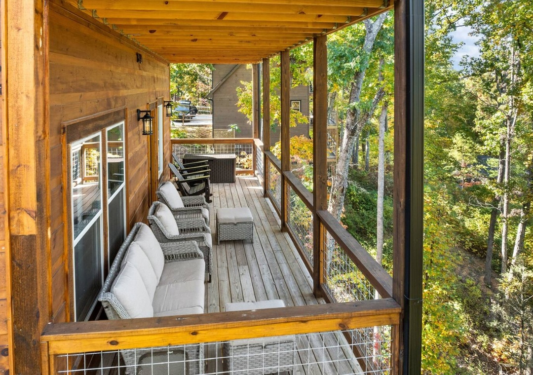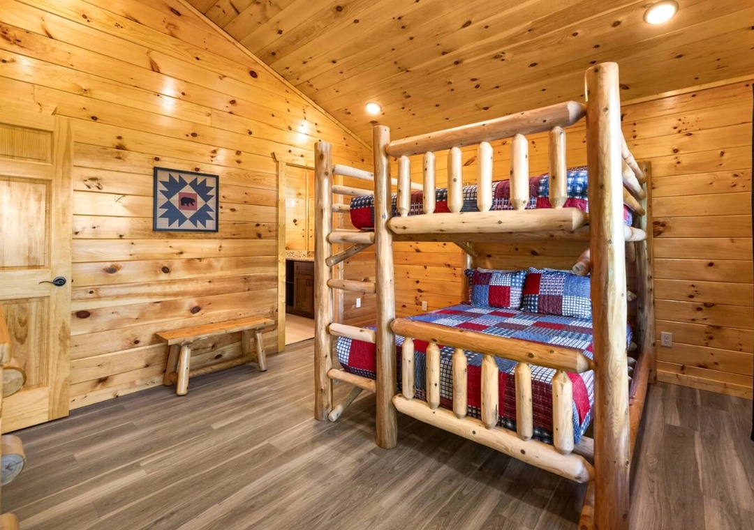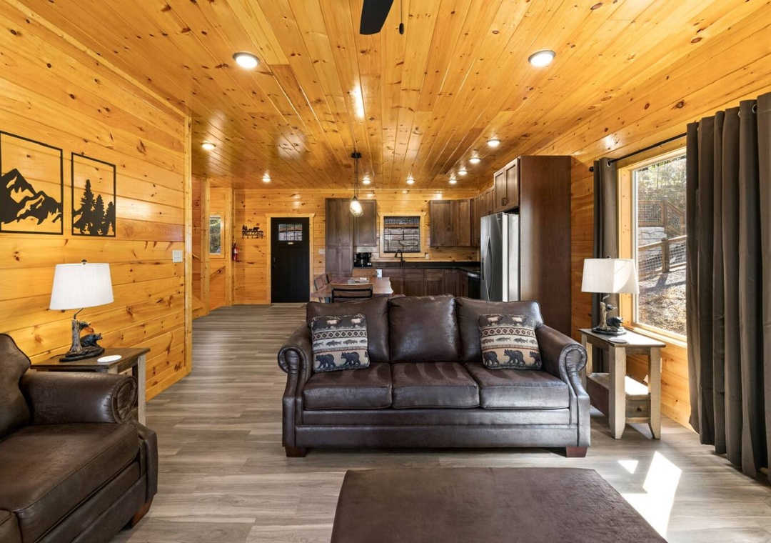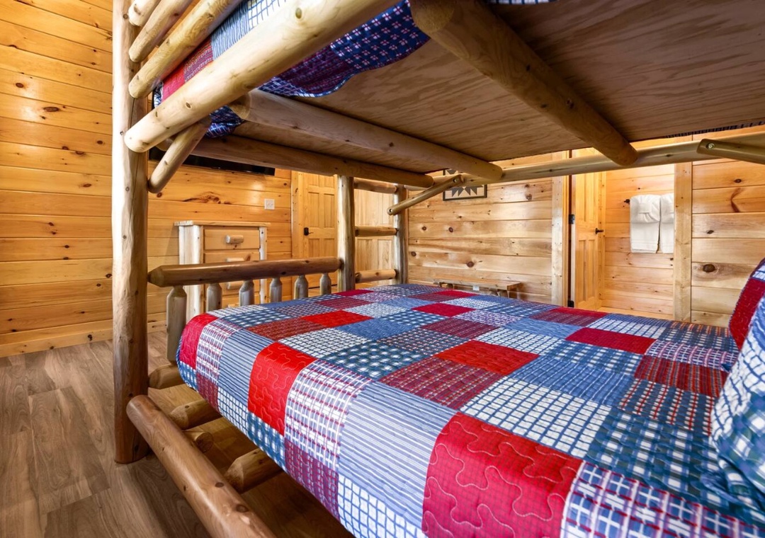 There are two king suites and one queen bunkbed suite in the cabin. There’s a sleeper sofa for additional sleeping space if needed. One king suite is located on the main level and has a walk-in shower in the en suite bathroom. All bedrooms have a view of Bluff Mountain and the two bedrooms on the upper level have private access to the top deck.