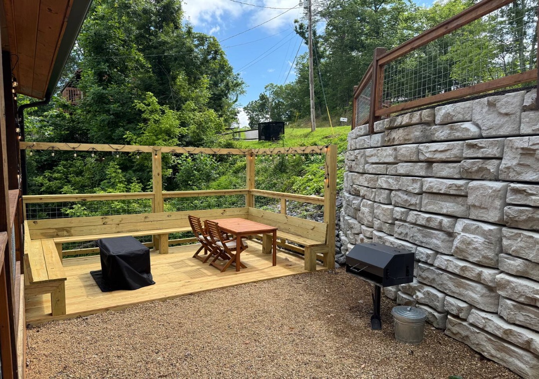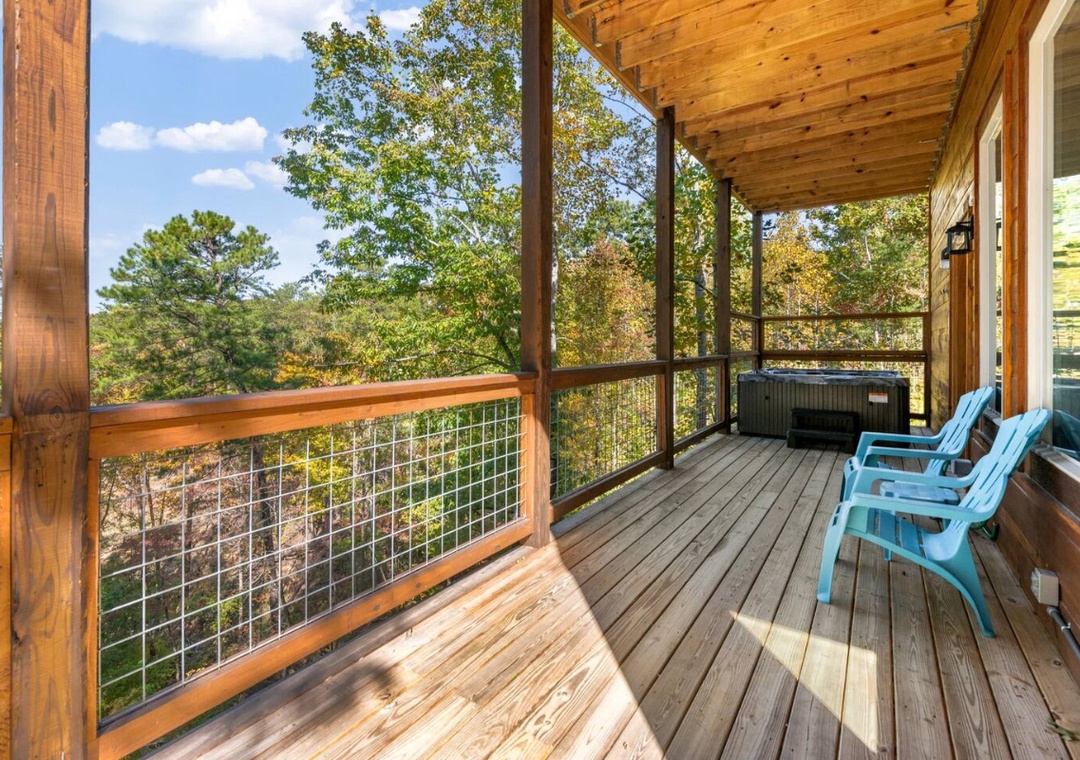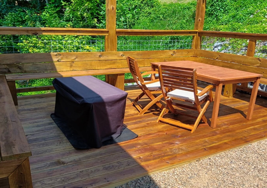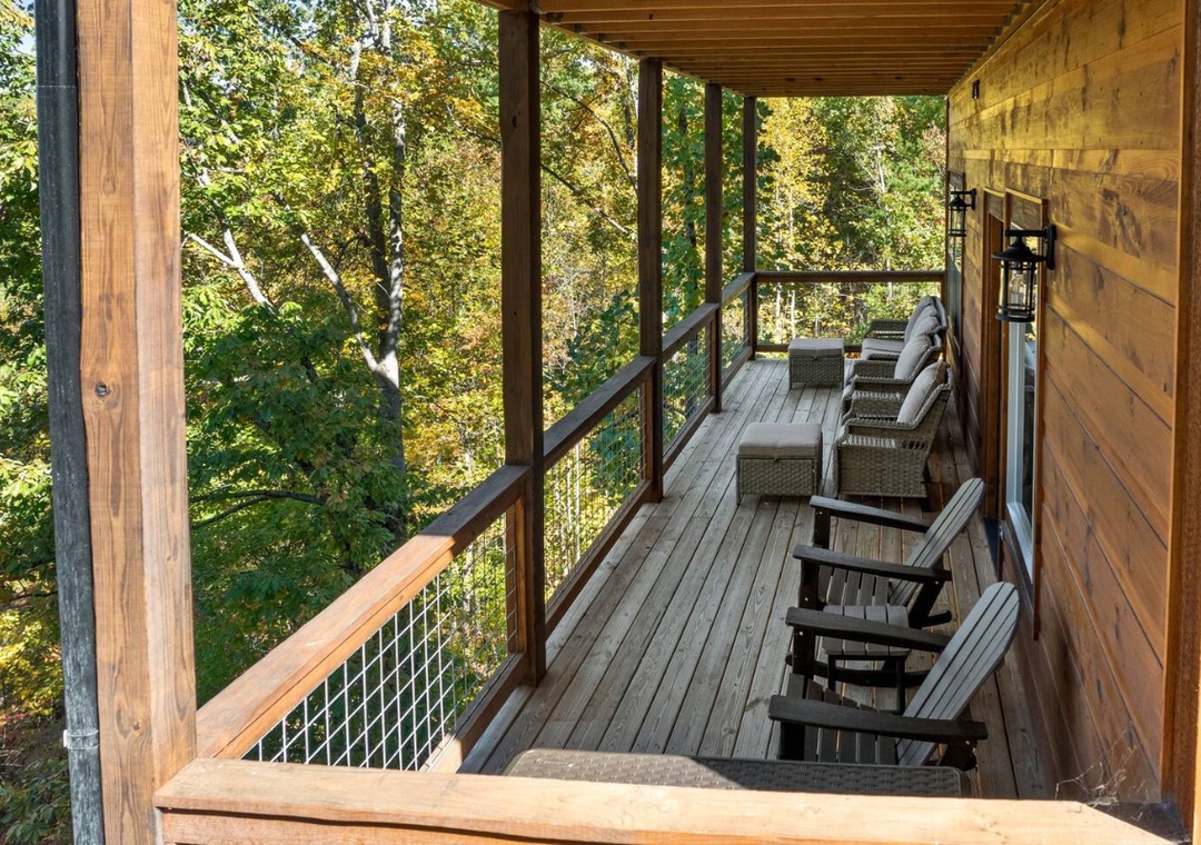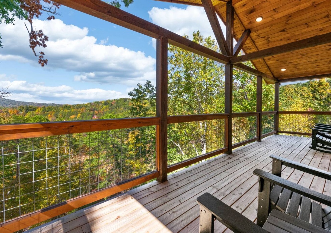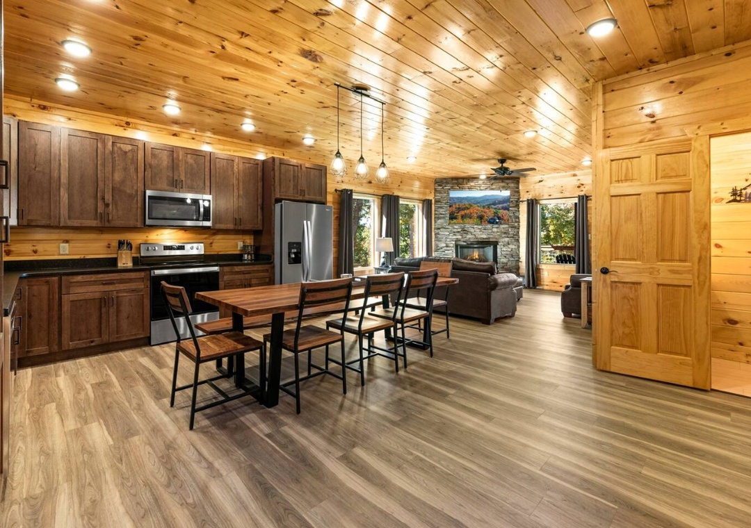 There are two king suites and one queen bunkbed suite in the cabin. There’s a sleeper sofa for additional sleeping space if needed. One king suite is located on the main level and has a walk-in shower in the en suite bathroom. All bedrooms have a view of Bluff Mountain and the two bedrooms on the upper level have private access to the top deck.