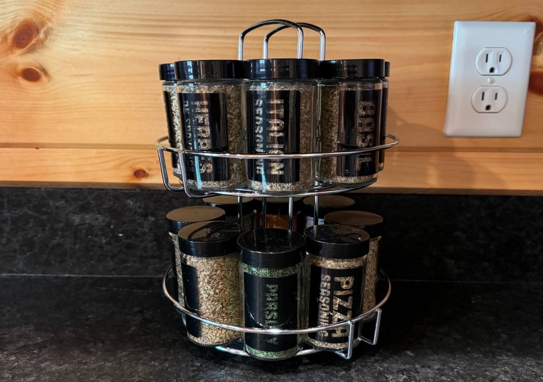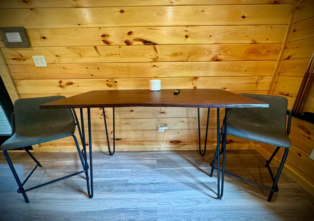 Cook meals in our well-equipped kitchen and enjoy eating them at our 8’ dining table. The park grill is in front of the cabin near the entrance allowing for easy access to the kitchen and dining area.