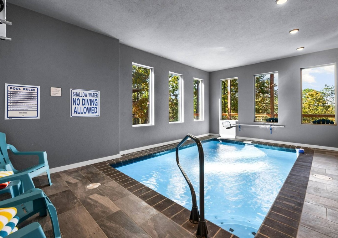 Sunset Splash is a beautiful new cabin completed in July 2024! This amazing cabin has all you need for comfort + entertainment: 2 king suites & 1 queen bunkbed suite, beautiful sunsets, 10 x 16 indoor heated saltwater pool, home theater, hot tub, game room with a pool table and arcade game, well-equipped kitchen & a park grill. Located on a quiet street close to town, the cabin is NOT in a resort development, which means cabins adjacent to us are spaced farther apart giving more privacy.