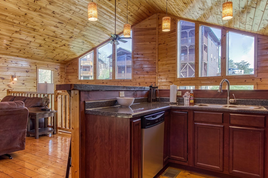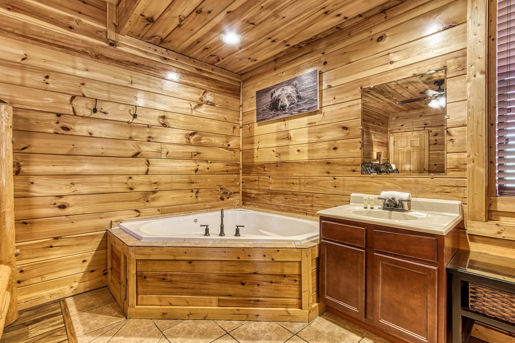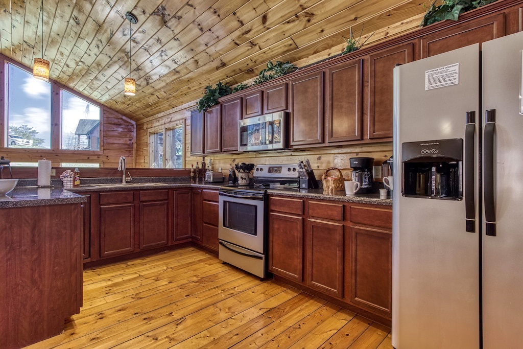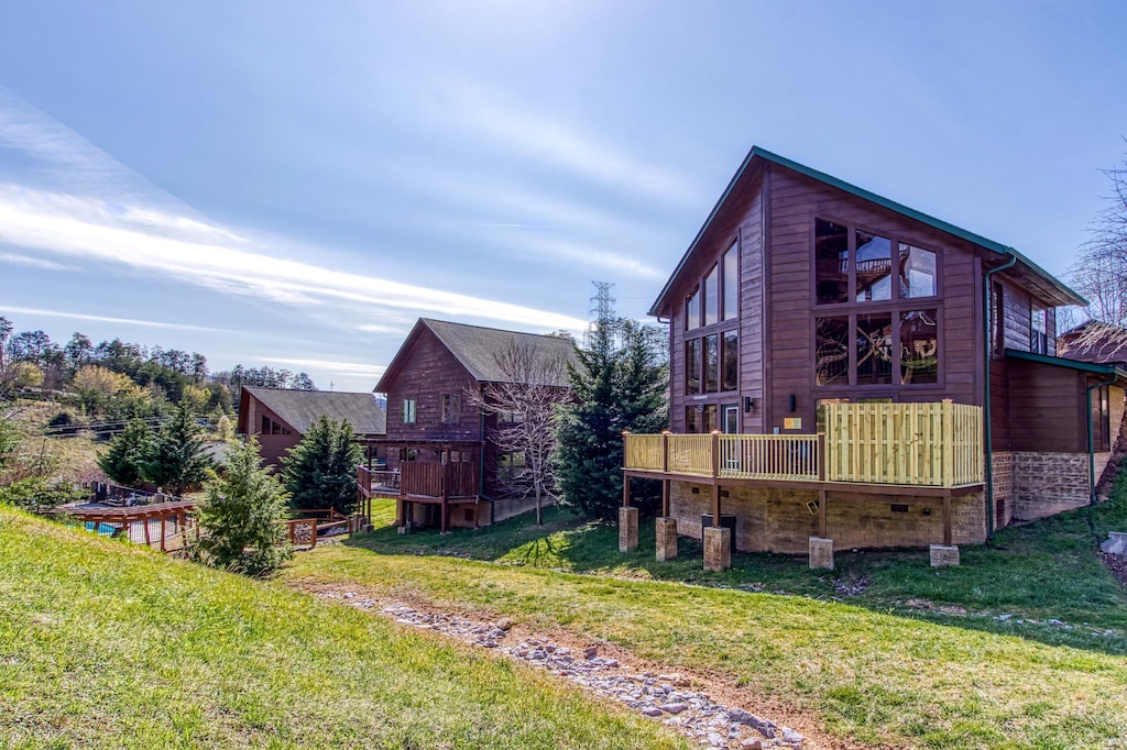 The cabin was beautiful and well stocked with everything you would need and perfect extras like games, drink refrigerator downstairs, a high chair and kids plates/utensils. Justin was extremely easy to communicate with and got back to me with any answers to questions right away. The location was PERFECT, close to everything and the pool was a few steps away. We would recommend this cabin to friends and family and would stay here again!- Reviewed On: 8/29/2023