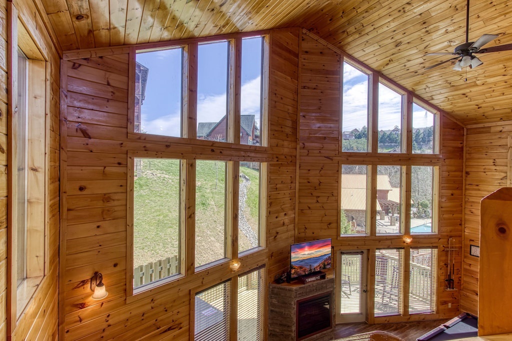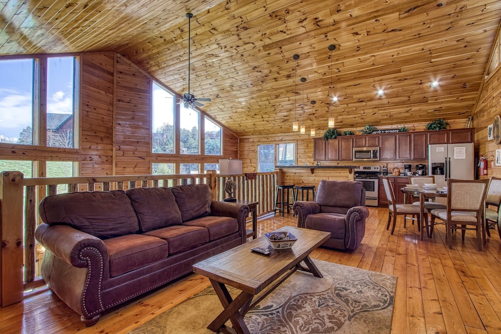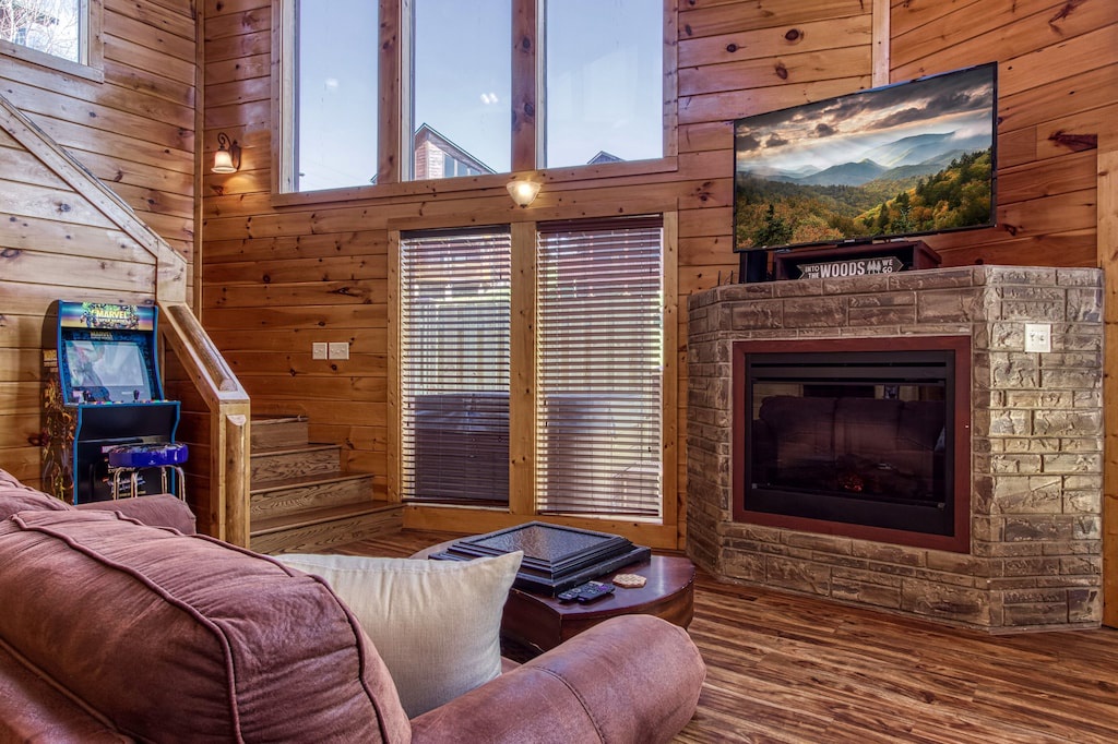Fully furnished cabin, high ceilings, large open living areas, two large fireplaces in both living spaces, large game room with pool table and arcade, fully equipped kitchen, multiple fireplaces, indoor jacuzzi tub